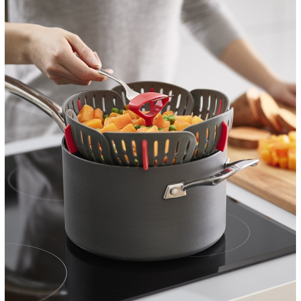 Duo är en innovativ serie köksartiklar från Joseph Joseph, som ger geniala lösningar till alla kök. Sortimentet är noggrant utformat med tonvikt på enkelhet, innovation, funktionalitet och kvalitet. Alla produkter i serien är tillverkade av högkvalitativa material och finns i en mängd olika färger, så att du kan matcha dem med din inredning eller andra kökstillbehör och köksredskap. I detta sortiment ingår t.ex. en ångkokare tillverkad av polypropen och silikon. De justerbara bladen anpassar sig till storleken på de flesta kastruller. Lämplig för användning med rostfritt stål och non-stick behållare med non-stick yta.