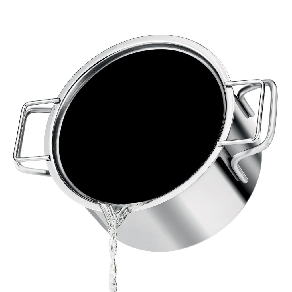 Två stora handtag hjälper till att hålla locket stadigt på kastrullen. När kastrullen lutas lyfter silikonet något och släpper ut en liten, lättkontrollerad vattenstråle. Ångan från kastrullen tränger ut genom ett litet hål och bildar inga moln runt händerna. Tack vare locket stannar maten kvar i behållaren.