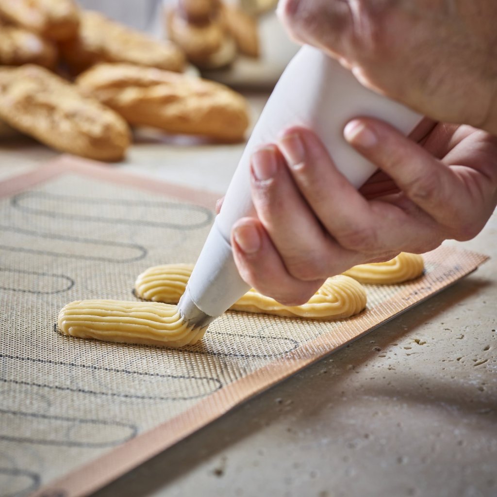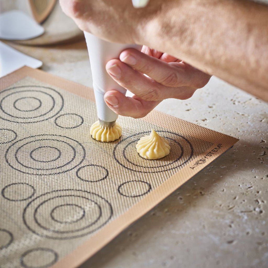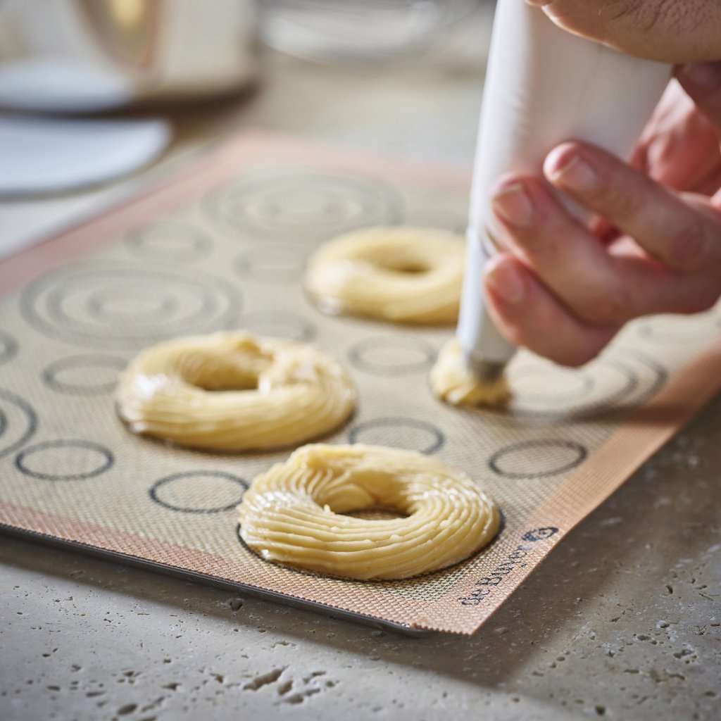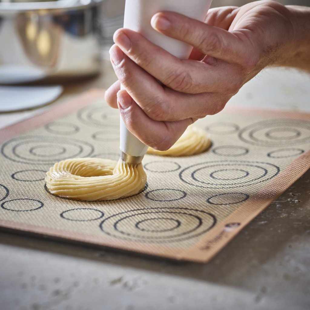 - Perforerad silikonbakmatta de Buyer AIRMAT är speciellt utformad för att tillaga smördeg som vindsnurror, éclairs eller Paris-Brest-bakverk