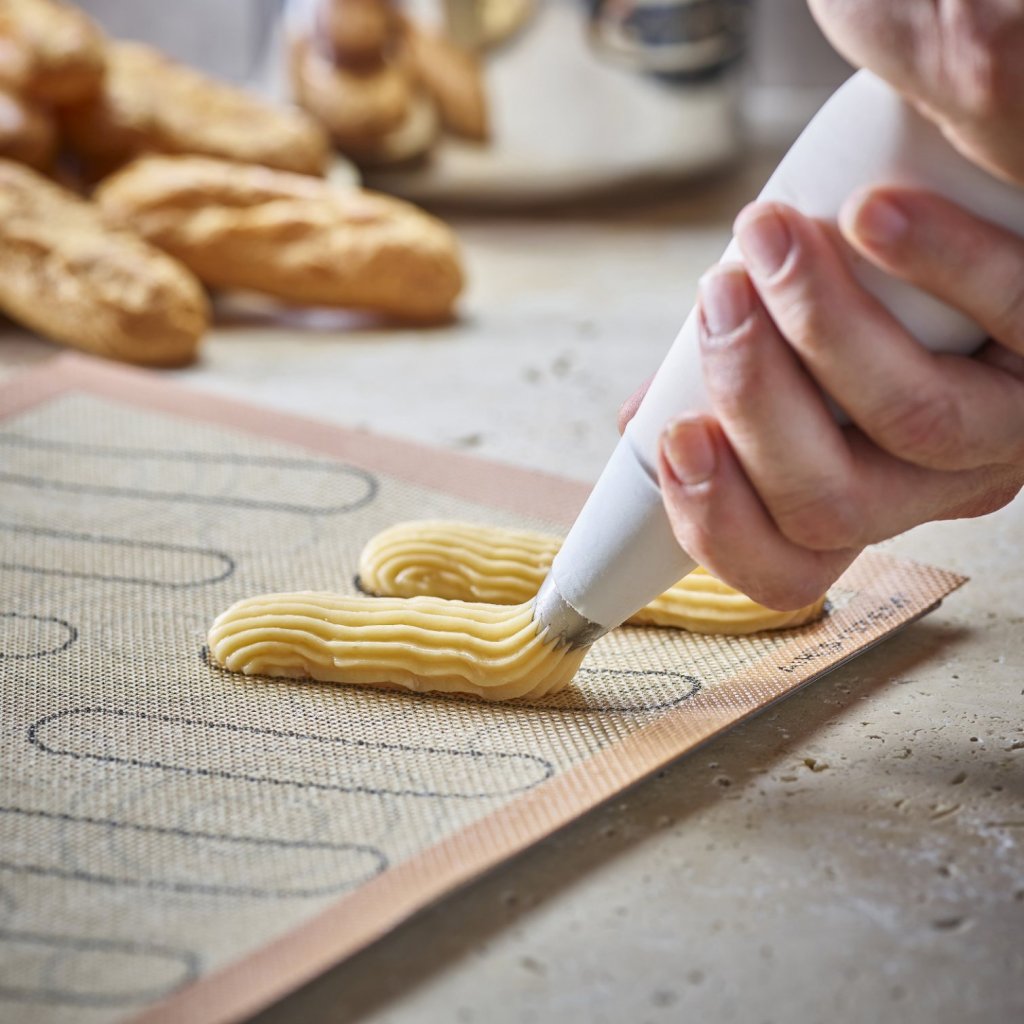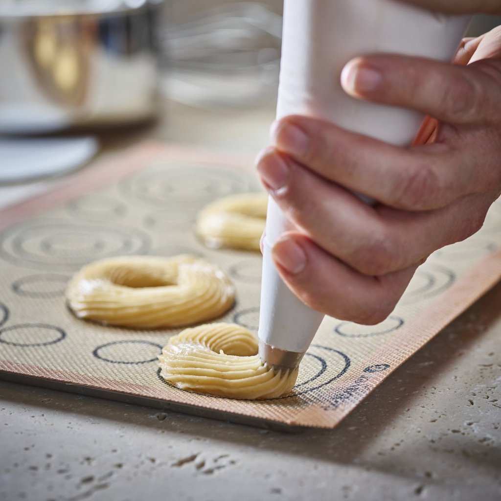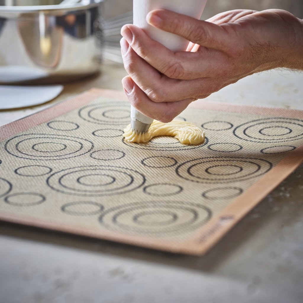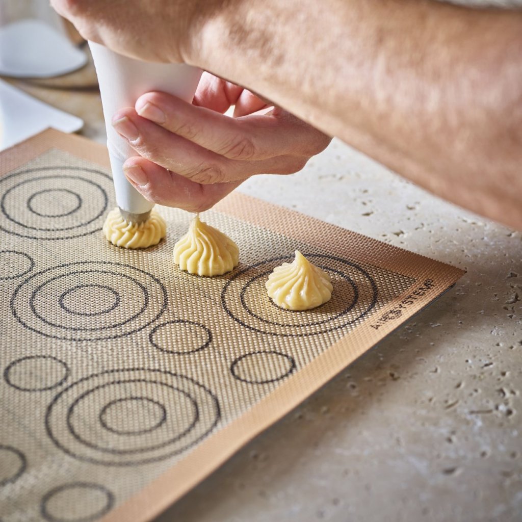 - Perforerad silikonbakmatta de Buyer AIRMAT är speciellt utformad för att tillaga smördeg som vindsnurror, éclairs eller Paris-Brest-bakverk
