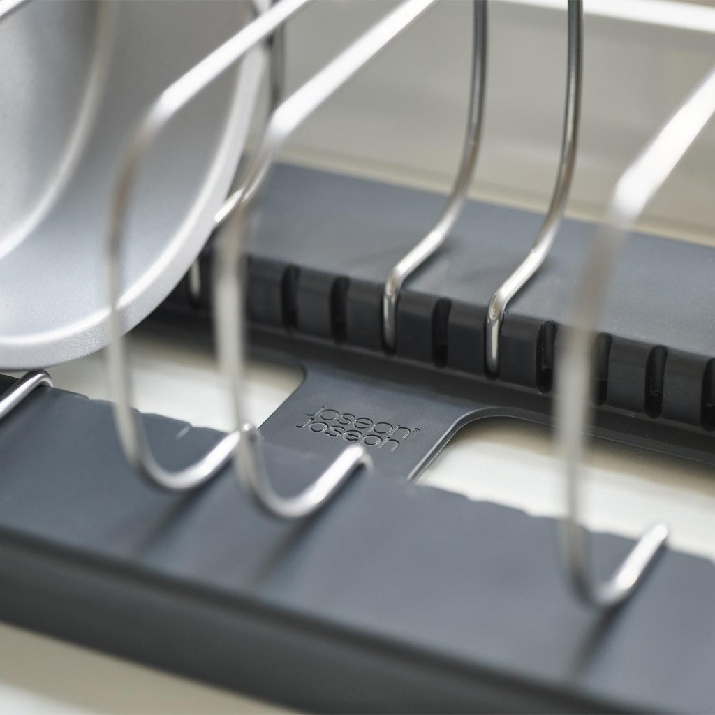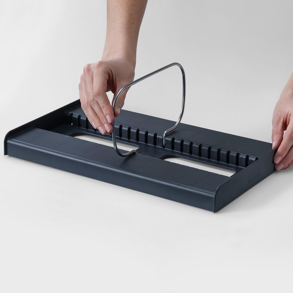 - Joseph Joseph DRAWERSTORE-organisatören för bakplåtar hjälper till att prydligt organisera bakplåtar, ugnsformar och tårtformar i kökslådan.