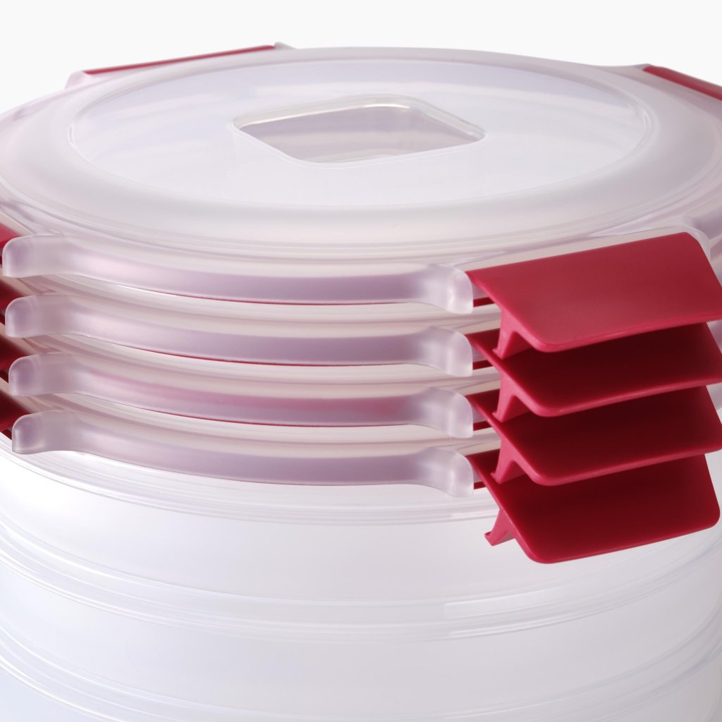 - Staplingsbara lock sitter stadigt på plats även vid förvaring av flera fyllda behållare ovanpå varandra, så att kylskåpet förblir överskådligt och organiserat.