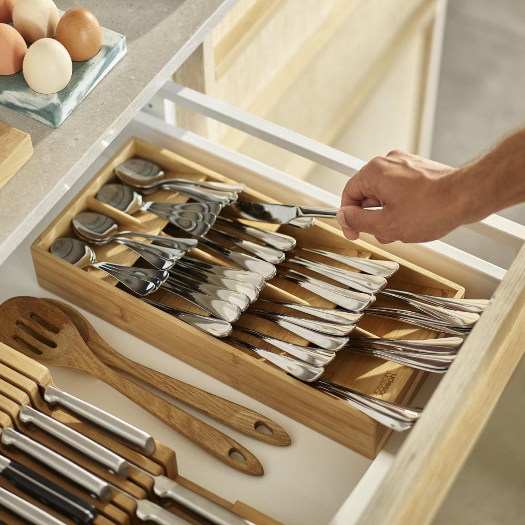 - Bestickbricka frÄn Joseph Joseph DRAWERSTORE möjliggör en överskÄdlig förvaring av en komplett uppsÀttning bestick i kökslÄdan.