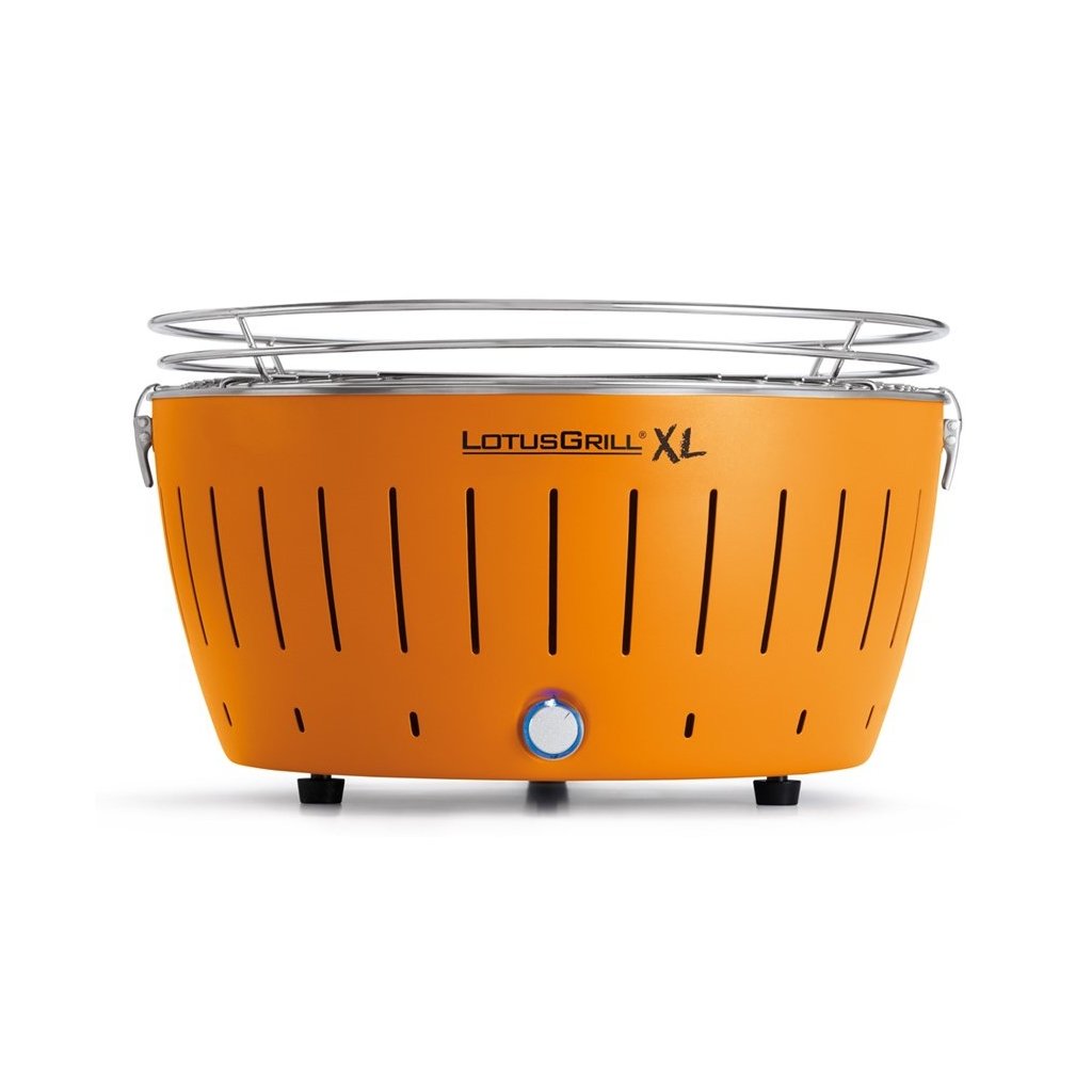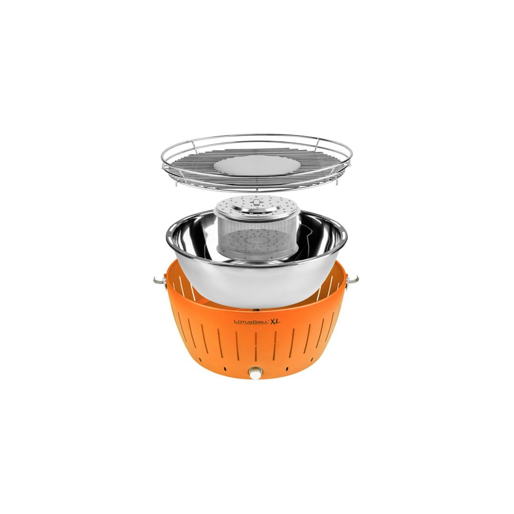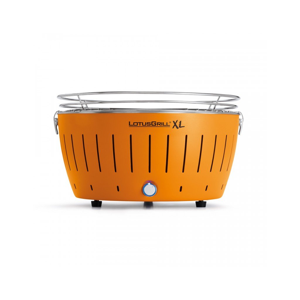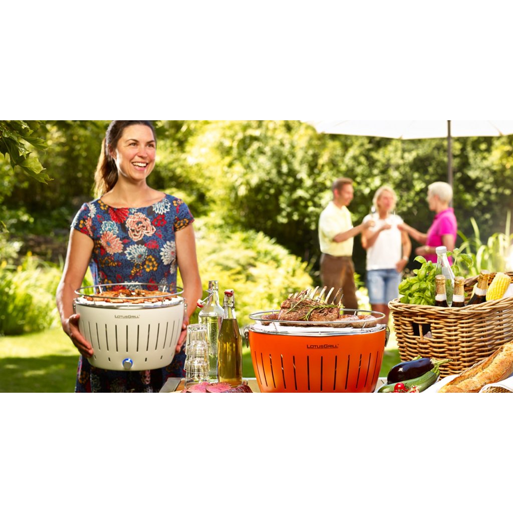 LotusGrill XL Àr en rökfri kolgrill som du kan anvÀnda i trÀdgÄrden, pÄ terrassen eller pÄ balkongen. Grillen har steglös temperaturkontroll, lÄg kolförbrukning (180 g kol rÀcker för ca 45-60 minuters anvÀndning), den Àr mycket enkel att anvÀnda och tillagningen gÄr riktigt snabbt. Grillen vÀrms upp pÄ 2-3 minuter tack vare den tysta flÀkten, som ser till att glöden vÀrms upp jÀmnt. Under grillningen droppar fettet ner i en sÀrskild behÄllare. Tack vare denna lösning möjliggör LotusGrill hÀlsosammare grillning utan lukt, utan rök och utan skadliga Àmnen. Grillytan pÄ 40,5 cm Àr tillrÀckligt stor för upp till 10 personer.