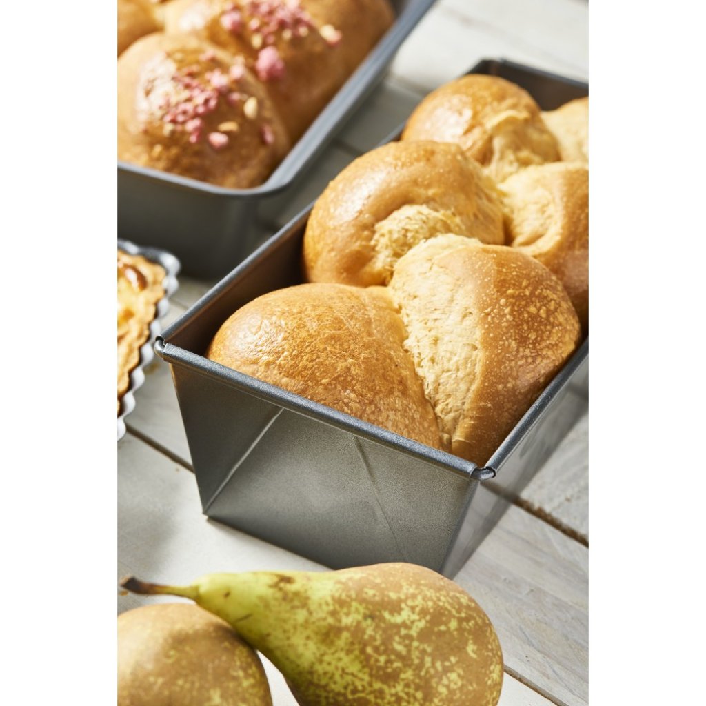 Denna form de Buyer är idealisk för bakning av bröd. Formen fördelar värmen jämnt och tål höga temperaturer. Den non-stick-belagda ytan gör det lättare att ta bort den. Non-stick-beläggningen skyddar stålet mot oxidation och underlättar rengöringen. Formen kan användas för traditionella ugnar (max. 220 °C). Ej lämplig för mikrovågsugn. Handtvätt rekommenderas.
