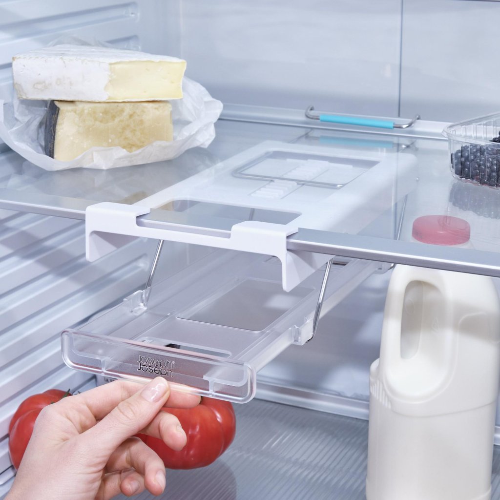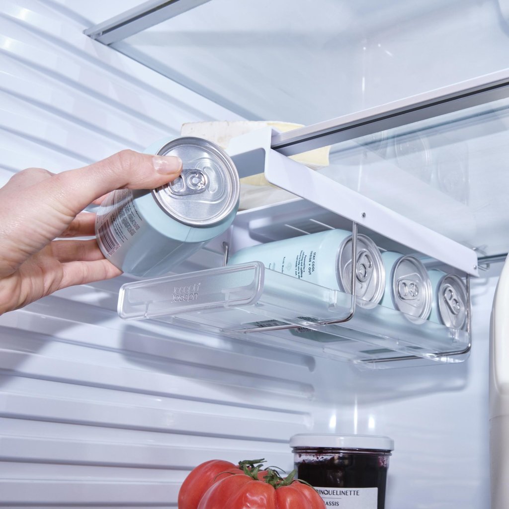 - Burkhållaren Joseph Joseph FRIDGESTORE under hyllan är en praktisk lösning för en överskådlig och utrymmesbesparande förvaring av drycker direkt i ditt kylskåp.