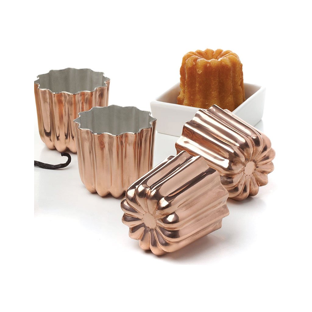 - räfflade formar i tennpläterad koppar, särskilt utformade för tillverkning av Canelé, de berömda Bordeaux-kakorna