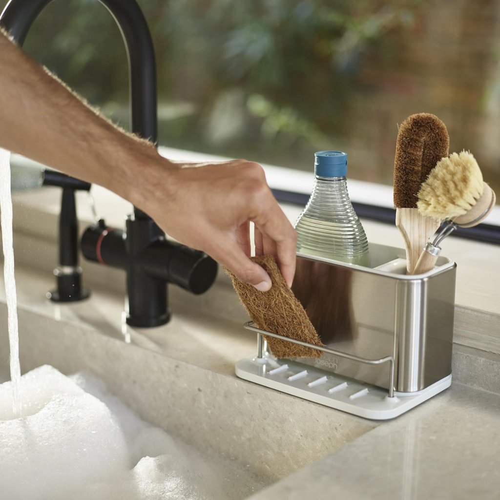 Det finns stunder då diskbänken känns som ett litet laboratorium fyllt med svampar, borstar och flaskor som står i vägen för varandra. Denna diskbänksorganisatör i rostfritt stål ger tydlig ordning och separerar de enskilda redskapen så att varje sak har sin plats. Istället för improvisation kommer ett enkelt system som fungerar varje dag.