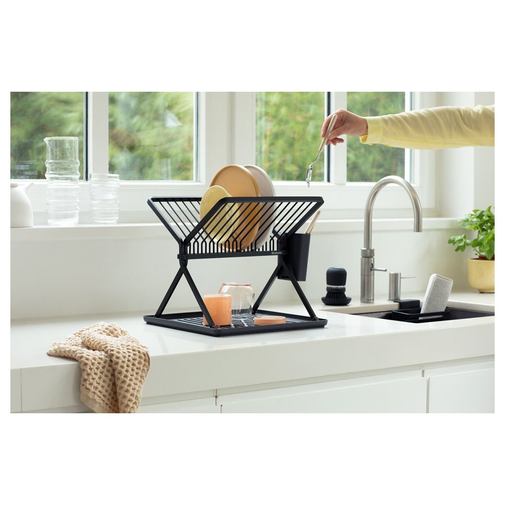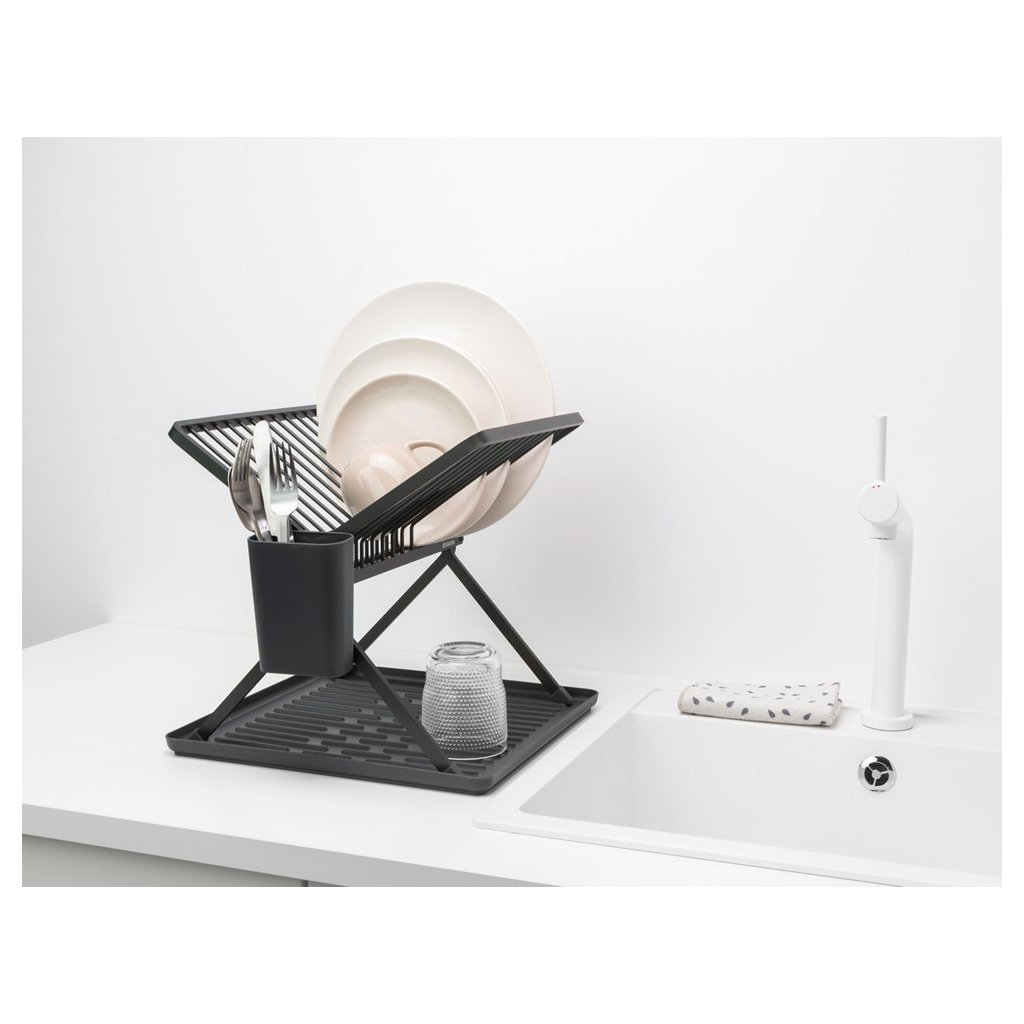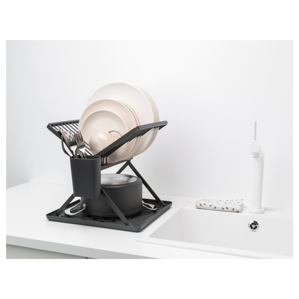 Brabantia SinkSide hopfällbart diskställ med droppbricka rymmer tallrikar, kastruller, stekpannor och glas på ett perfekt sätt. Rymmer upp till 13 tallrikar eller kastruller, stekpannor och glas. Korgen för torkning av bestick och porslin är löstagbar, vilket gör det enkelt att fälla ihop korgen och rengöra den. Den är tillräckligt vacker för att ha en permanent plats i ditt kök, men den är också mycket portabel.