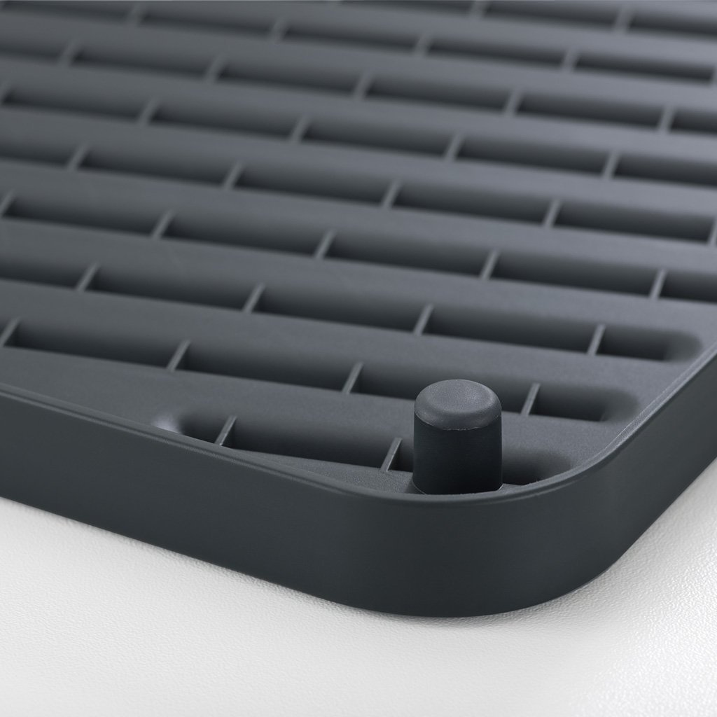 Den platta, utrymmessnåla JOSEPH JOSEPH Flip-up avrinningskärlet med två fällbara hållare för sex tallrikar. Droppbrickan är utrustad med halkfria fötter och ett avlopp för droppande vatten i diskhon.