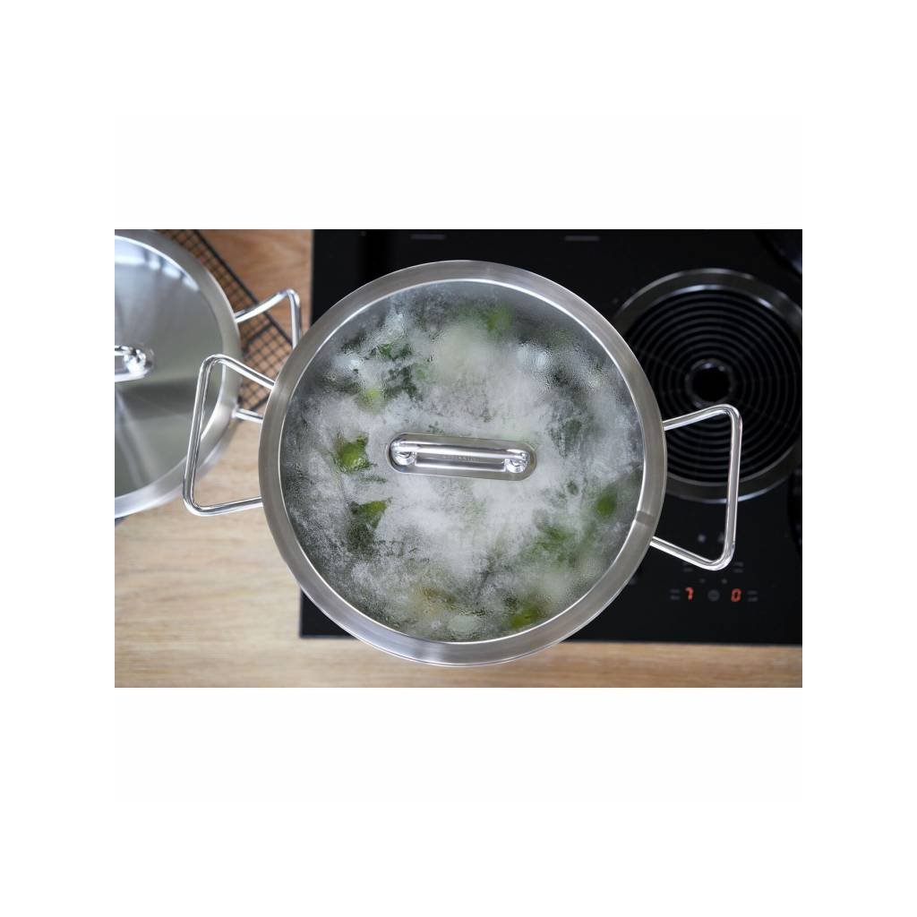 Zwilling Pro hög gryta med lock i rostfritt stål med en diameter på 20 cm i vacker matt finish och stora handtag är lämplig för hemmabruk och professionell användning. Den titanoxidhärdade sandwichbotten är idealisk för energieffektiv matlagning. Den är lämplig för alla värmekällor, inklusive induktion, och för bakning i ugn.