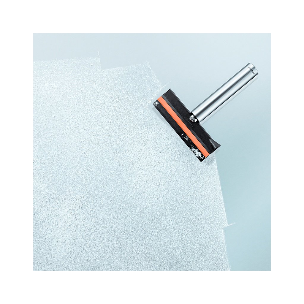 Fällmekanismen är enkel: Skrapans plastblad sitter som standard i ett handtag av rostfritt stål. Använd skrapan genom att ta tag i handtaget och med den andra handen skjuta ut skrapbladet så att det är vinkelrätt mot handtaget. Vrid sedan handtaget moturs för att säkra klingans position.