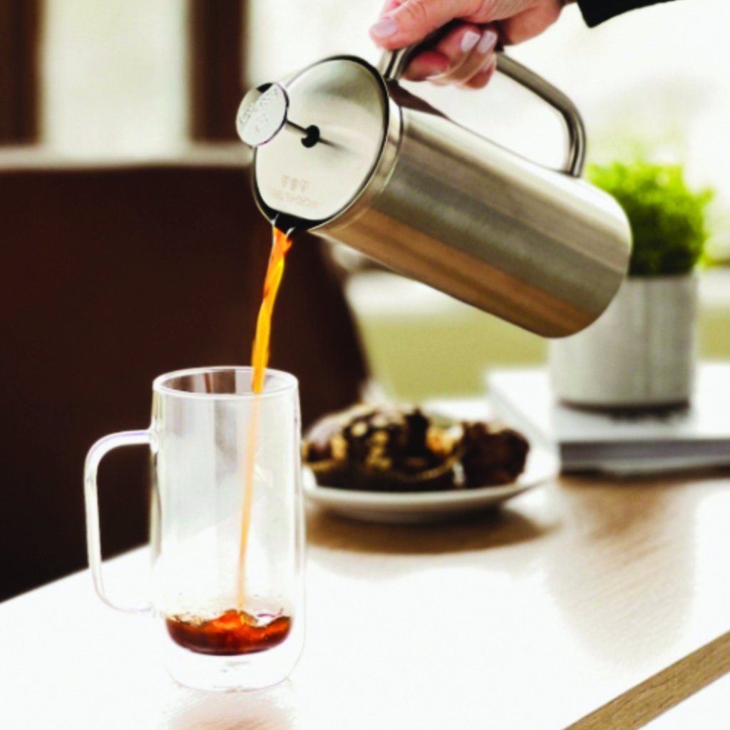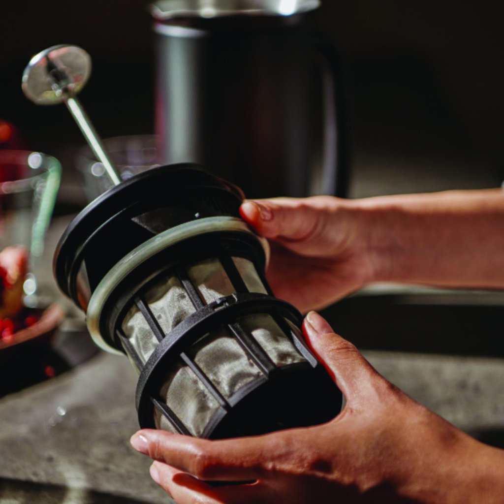 - utrustad med en dubbelkolv med fina mikrofilter som filtrerar 9x och 12x finare än konventionella franska pressar