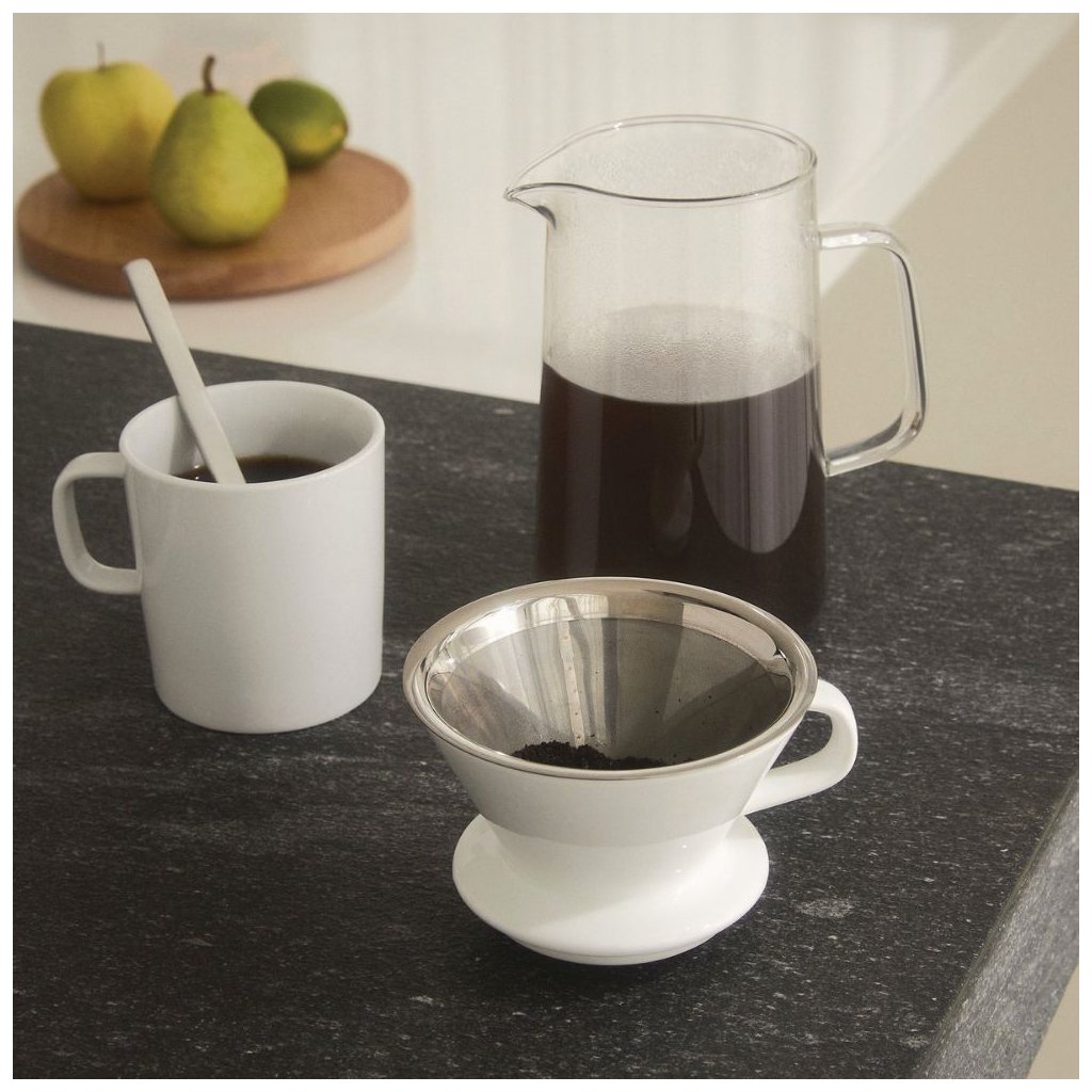 - inkluderar en manuell kaffekvarn och ett återanvändbart kaffefilter i rostfritt stål