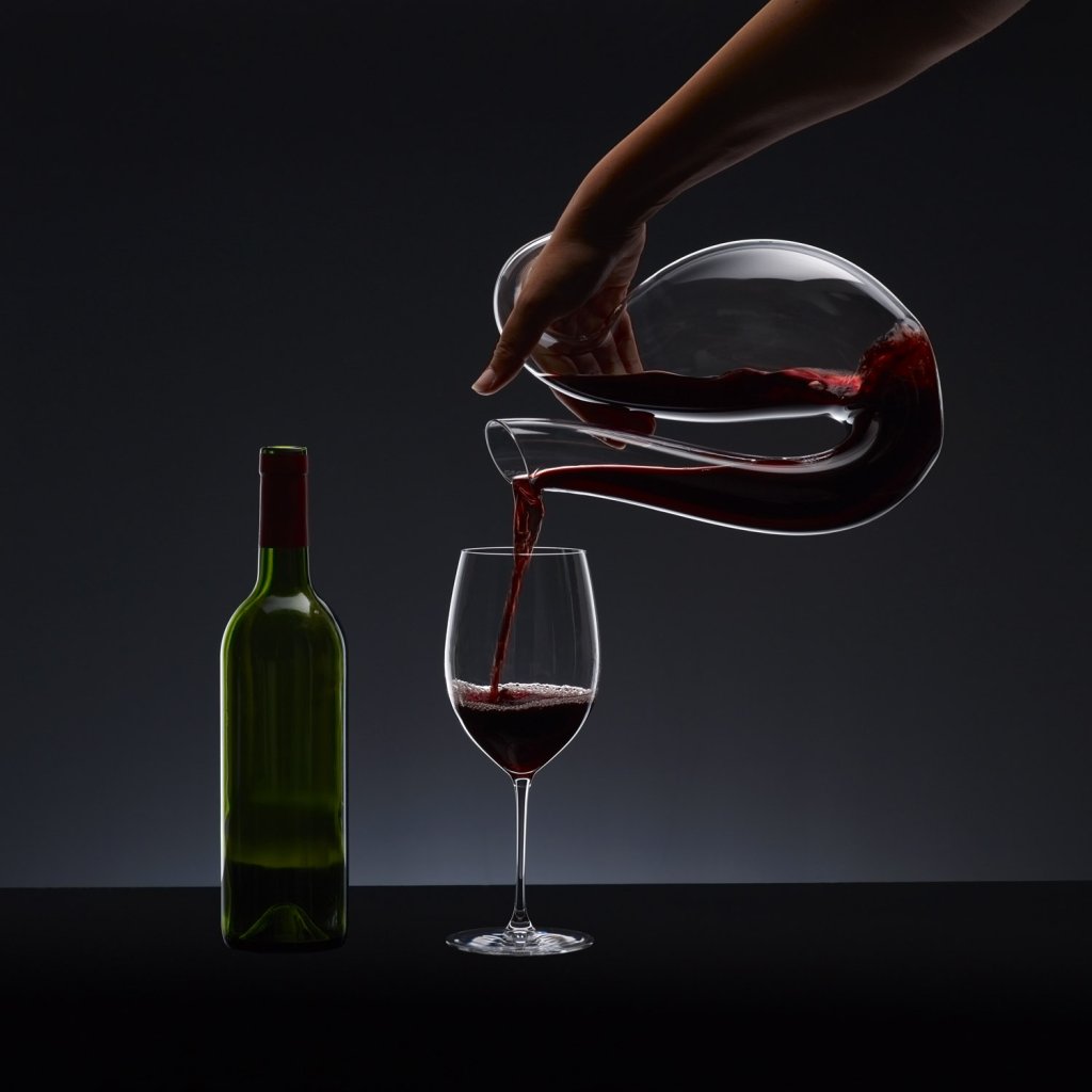 Karaffens form med två kammare påskyndar dekantering av vinet eftersom det vilar i två kammare. Vid upphällning luftas den sedan i den första kammaren så att den perfekta mängden för servering rinner in i den andra kammaren. Karaffens form har utformats med en stark betoning på balans. Ett övertygande bevis är den otroliga fjädringsfunktionen. Du kan ställa karaffen på bordet, men också hänga den på bordskanten, bar. Hanteringen är bekväm och säker. Den perfekta designen och den perfekta balansen kommer att tilltala alla vinälskare.