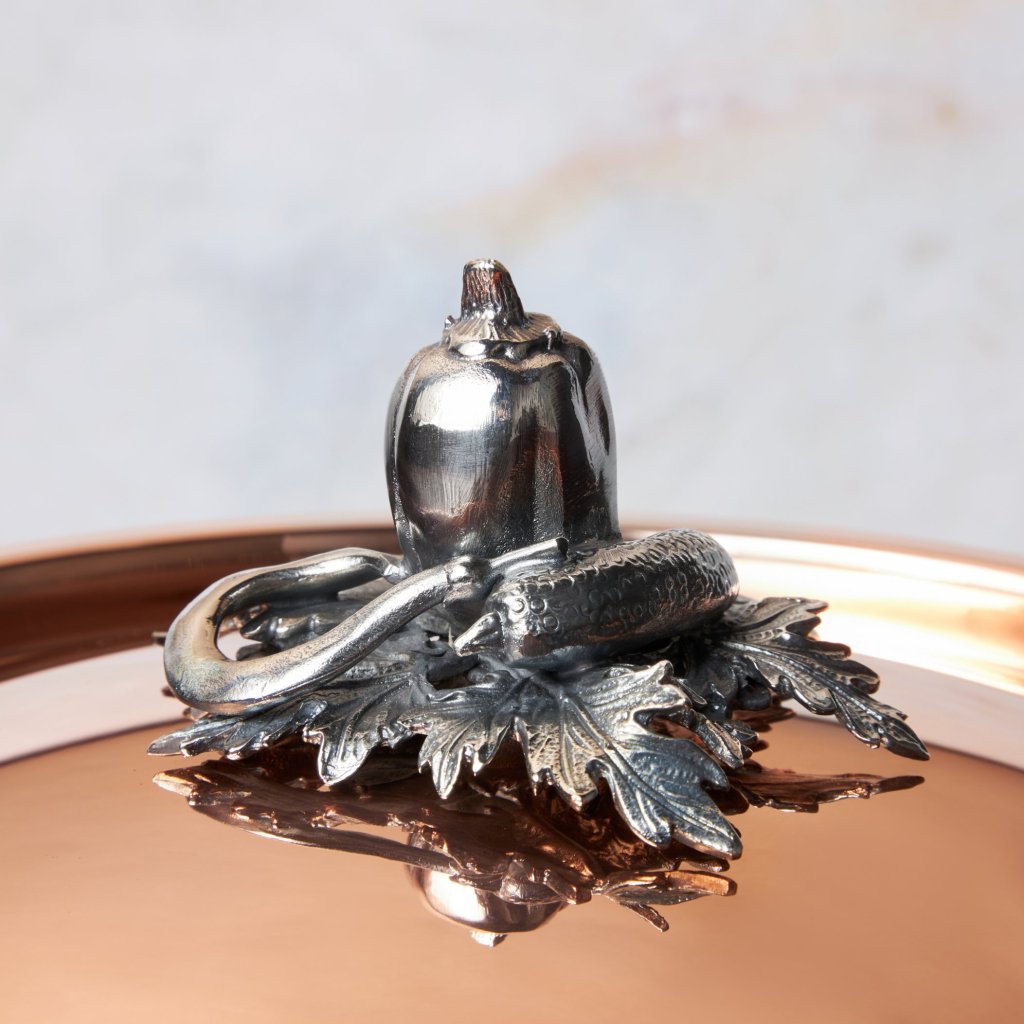 - lock i massiv koppar med handtag i en vacker dekoration av olika grönsaker, som är handgjuten i massiv brons och silverpläterad