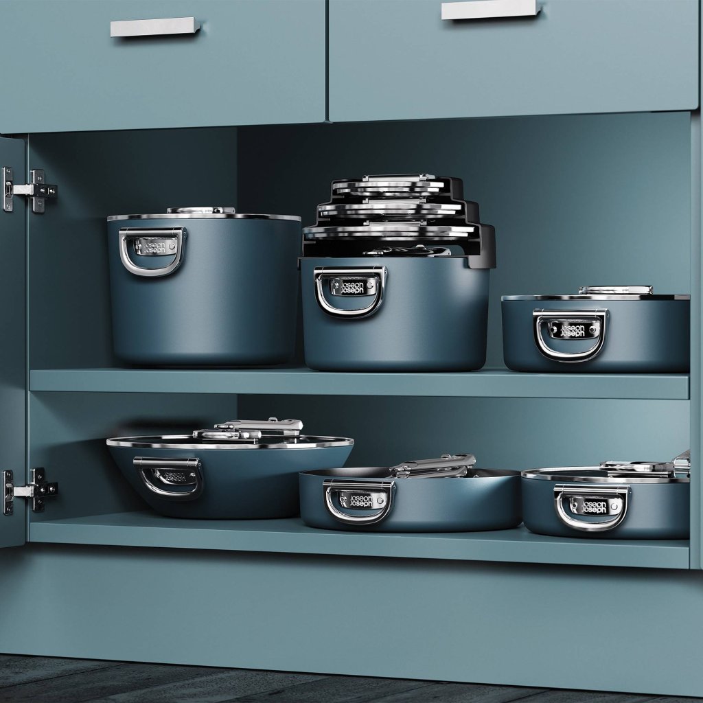 - Tack vare de vikbara handtagen kan kastrullerna enkelt staplas i varandra, vilket sparar upp till 50 % mer förvaringsutrymme jämfört med vanliga köksredskap.