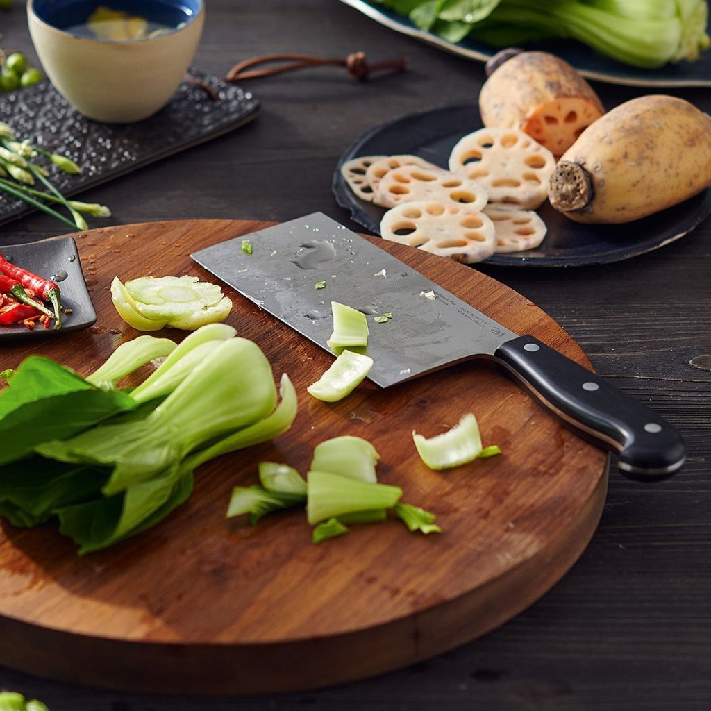 Den kinesiska kockkniven Spitzenklasse Plus är idealisk för tillagning av kött, fisk och grönsaker på traditionellt kinesiskt vis. Dess form liknar en köttyxa, men tjockleken på bladets baksida är hälften (2 mm). Inte så lämplig för gräsklippning.