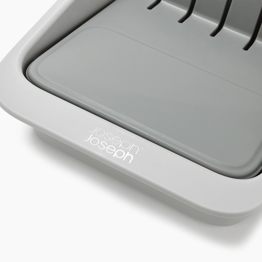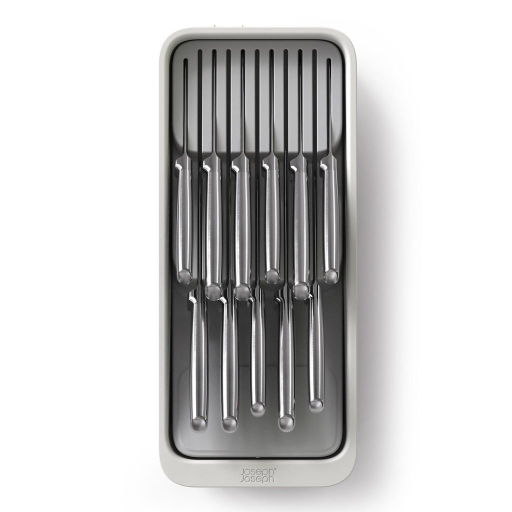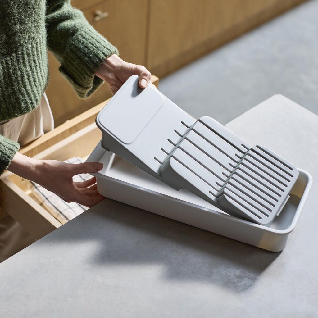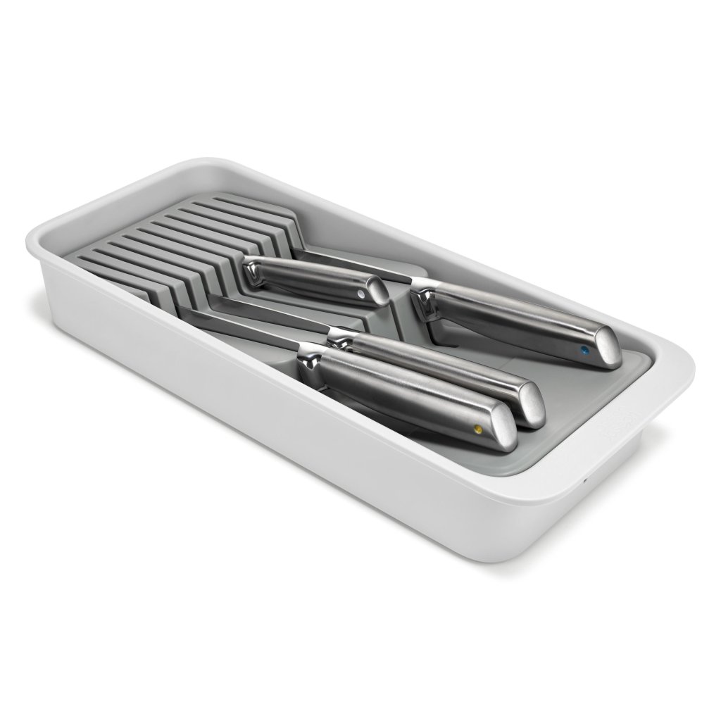 - Den kompakta knivorganisatören Joseph Joseph DRAWERSTORE gör det möjligt att säkert förvara köksknivar direkt i lådan.