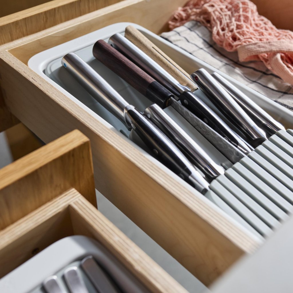 - Förvaring av knivar i lådan hjälper till att hålla bänkskivan fri och köket ser mer organiserat ut.