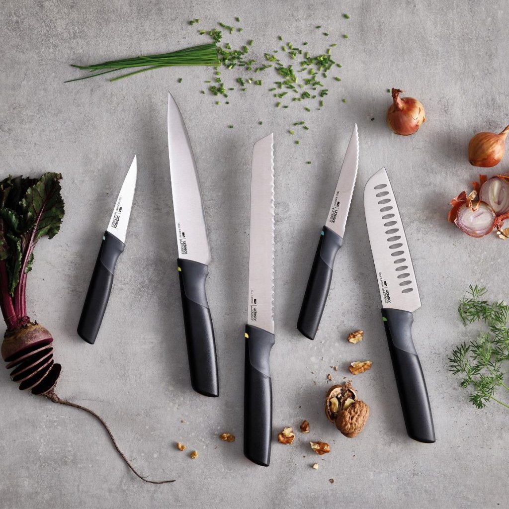 - En uppsÀttning med 5 köksknivar frÄn Joseph Joseph ELEVATE OPAL erbjuder en genomtÀnkt kombination av knivar för daglig matlagning, som hjÀlper dig att skÀra, portionera och förbereda ingredienser fint utan att behöva leta efter ytterligare redskap.