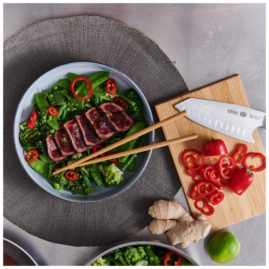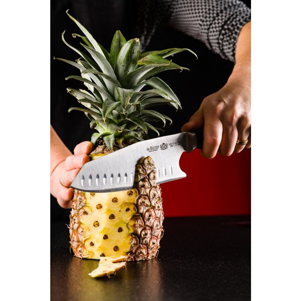 Den asiatiska kockkniven från Fibre Karbon 2-kollektionen från De Buyer kombinerar det bästa av europeiska och japanska knivar. Den kännetecknas av extrem skärpa och har mångsidig användning.