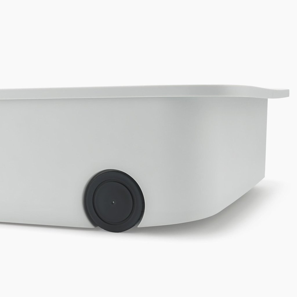 - Hjulen på undersidan säkerställer smidig rörelse av förvaringen längs hyllan, så att den enkelt kan dras ut även ur djupare köksskåp.