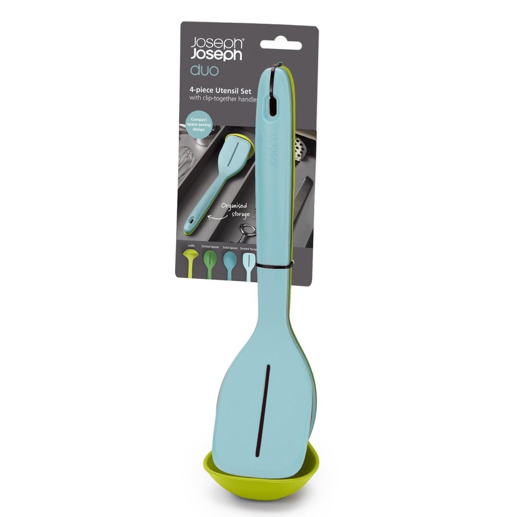 - Joseph Joseph DUO OPALs fyrdelade set med köksredskap för lÄdor erbjuder en praktisk och utrymmesbesparande lösning för daglig matlagning i ett modernt hem.
