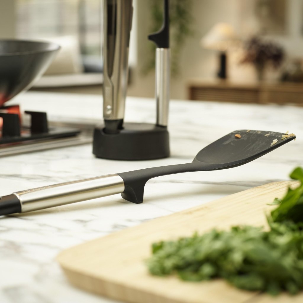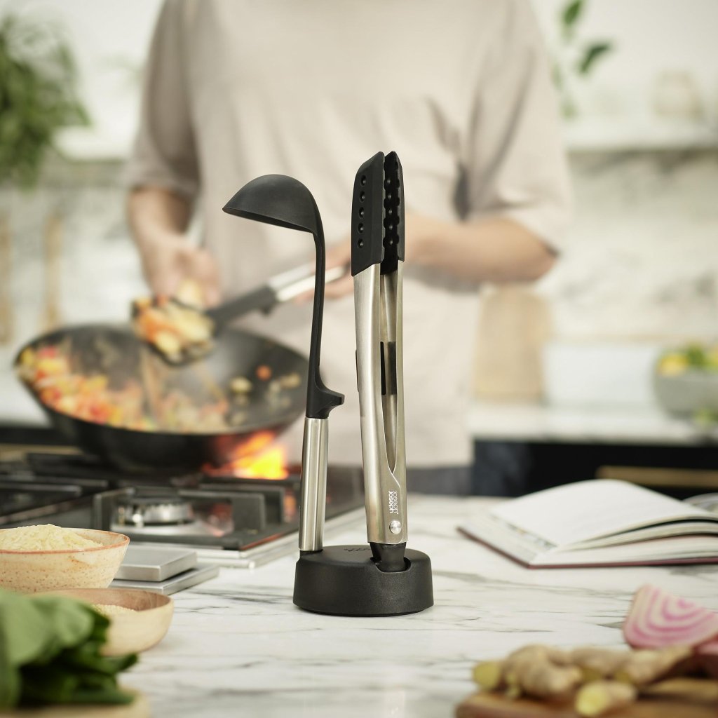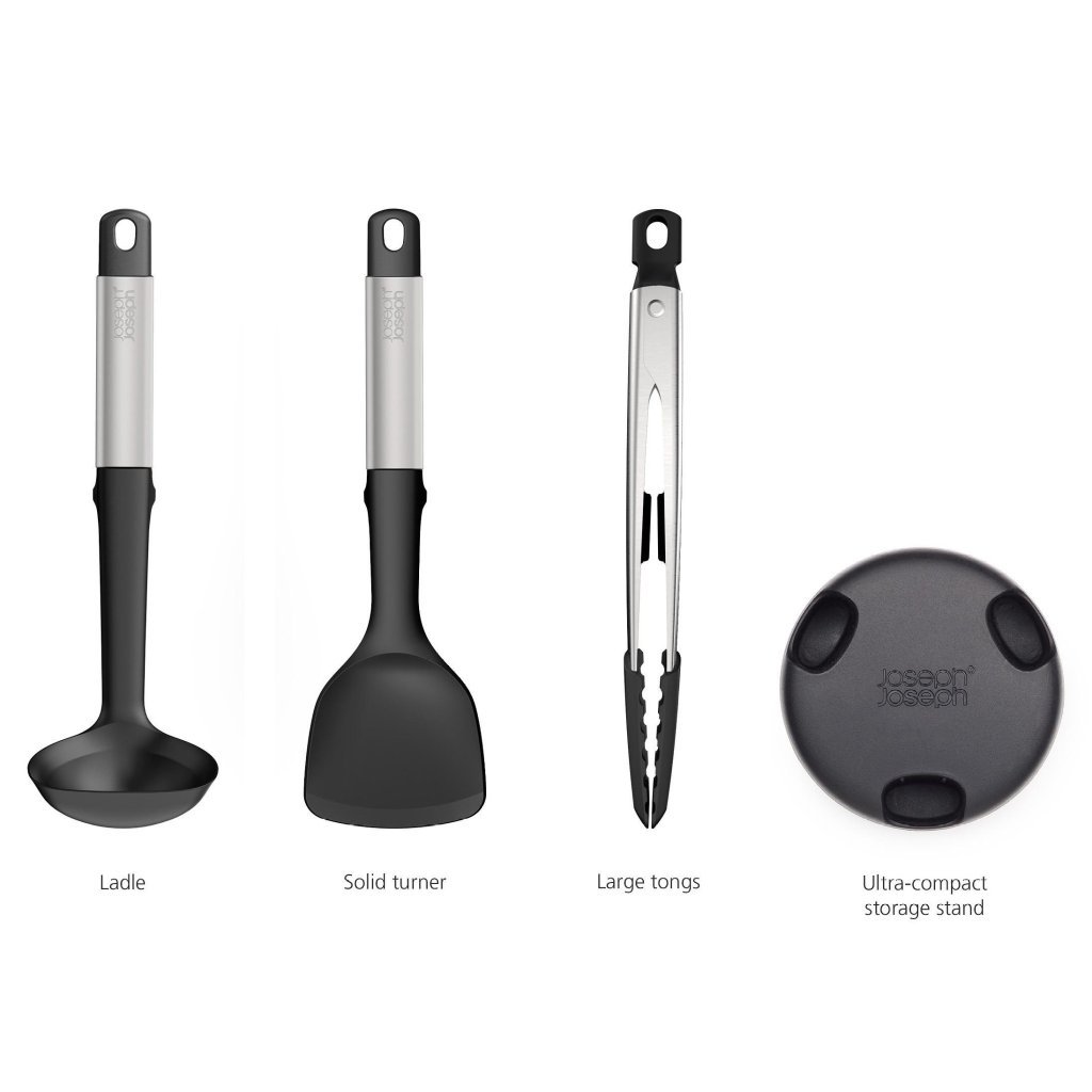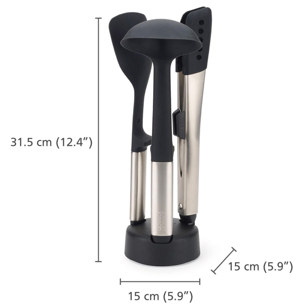 - Den erbjuder 3 viktiga verktyg för daglig matlagning, förvarade i ett kompakt stativ för enkel och tydlig organisation på köksbänken.