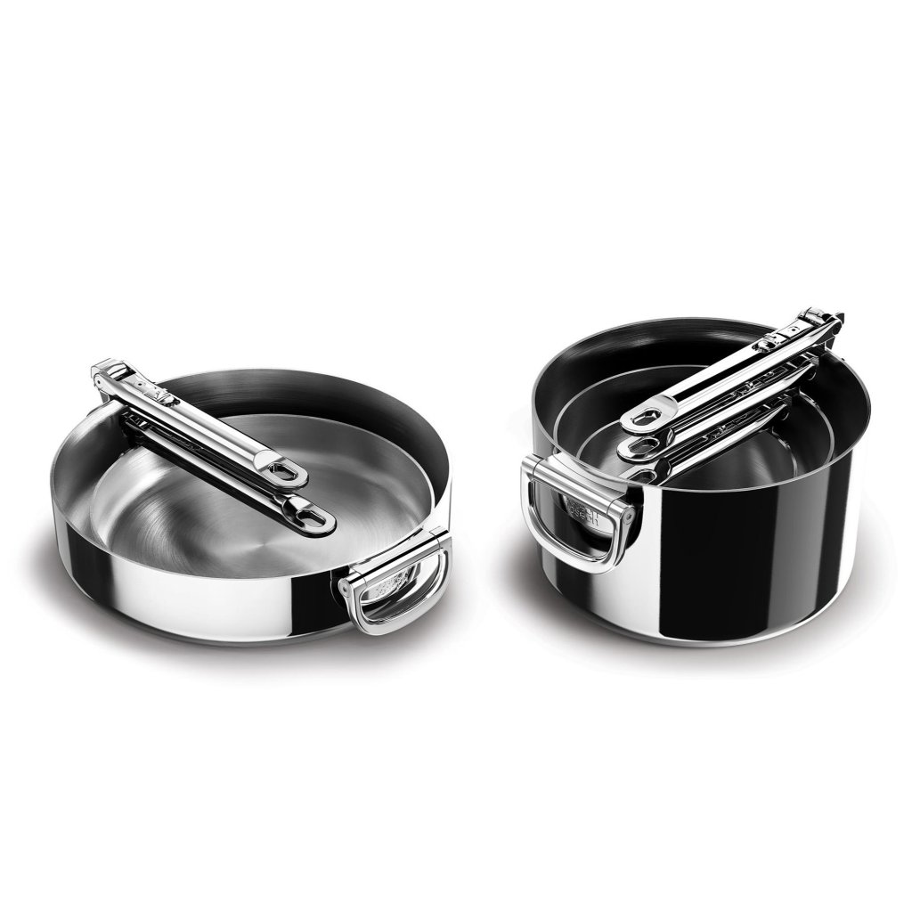 - Den kompakta stapelbara designen gör att enskilda kastruller och stekpannor kan skjutas in i varandra, medan de fällbara handtagen avsevärt minskar utrymmeskraven med upp till 50 %.