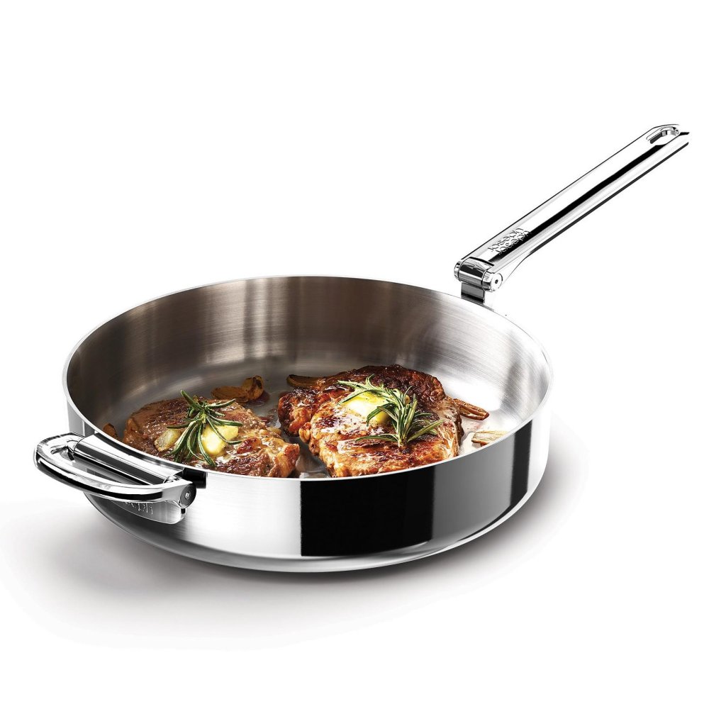 - Den robusta trelagerskonstruktionen kombinerar en polerad yttre yta i rostfritt stål, en aluminiumkärna för jämn värmefördelning och ett inre lager av rostfritt stål.