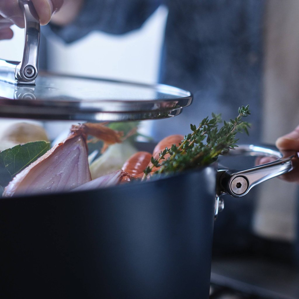 - Tack vare de hopfällbara handtagen kan de enskilda delarna enkelt staplas i varandra, vilket sparar upp till 50 % mer förvaringsutrymme jämfört med vanliga kokkärl.