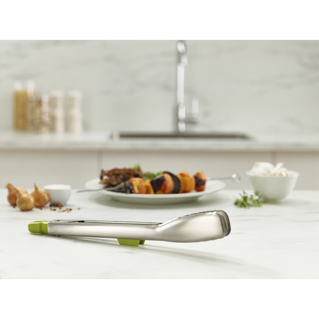 Elevate köksredskap från Joseph Joseph har handtag som är formade som ett stöd, och när redskapet läggs undan ligger arbetsdelen kvar på en höjd över arbetsytan, så att den skyddas från kontaminering. Tången i rostfritt stål är försedd med fjäder och låses genom att skjuta ut locket i änden av handtaget.