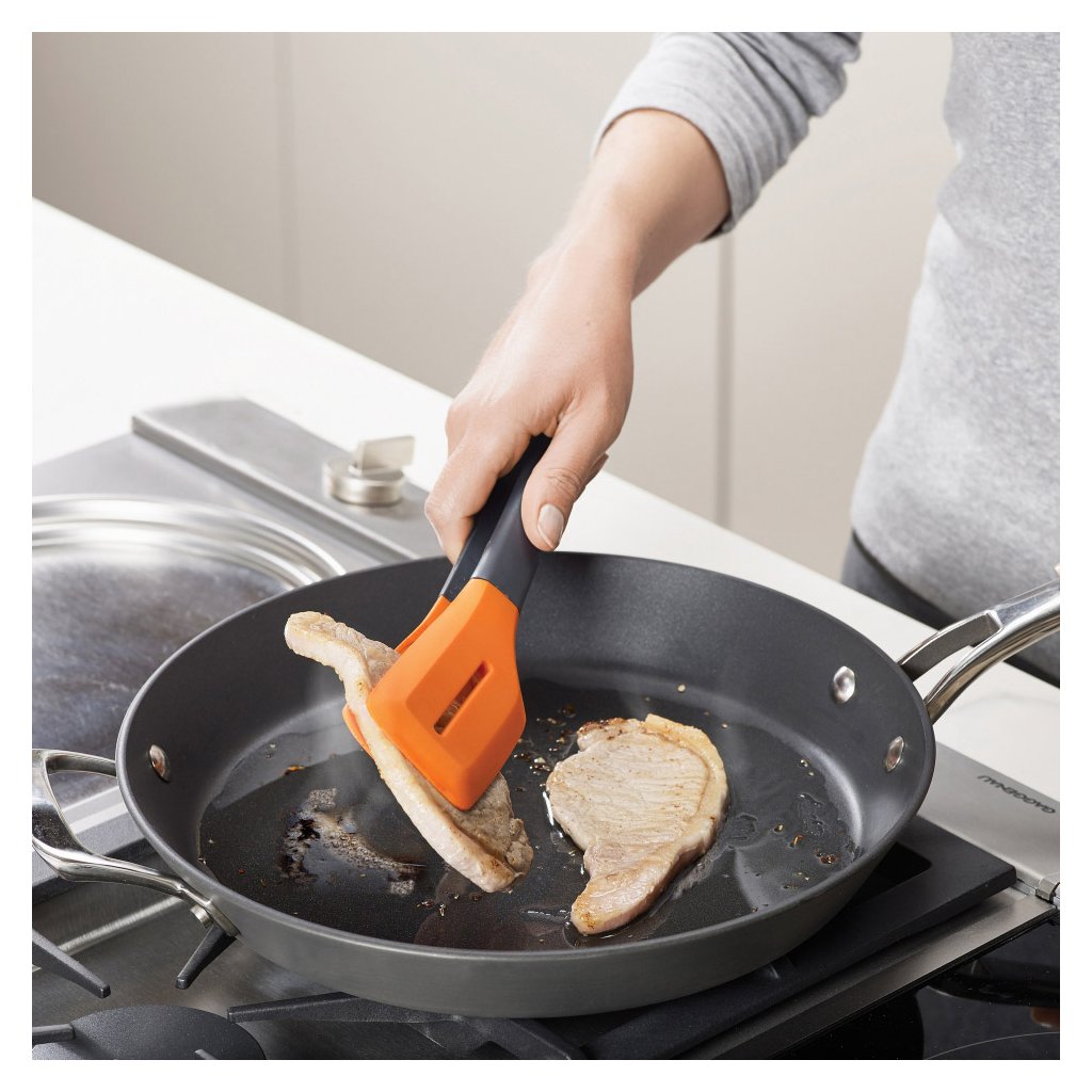Den breda vändaren är utmärkt för att stödja biffar, hamburgare och fiskfiléer, men när det kommer till vändning vinner tången helt klart. Denna strid inspirerade konstruktörerna av Joseph Joseph, som skapade en tång med en platt och stor arbetsdel. Så ingenjörerna har tagit det bästa från båda verktygen och skapat ett verktyg som kan hantera allt i pannan.