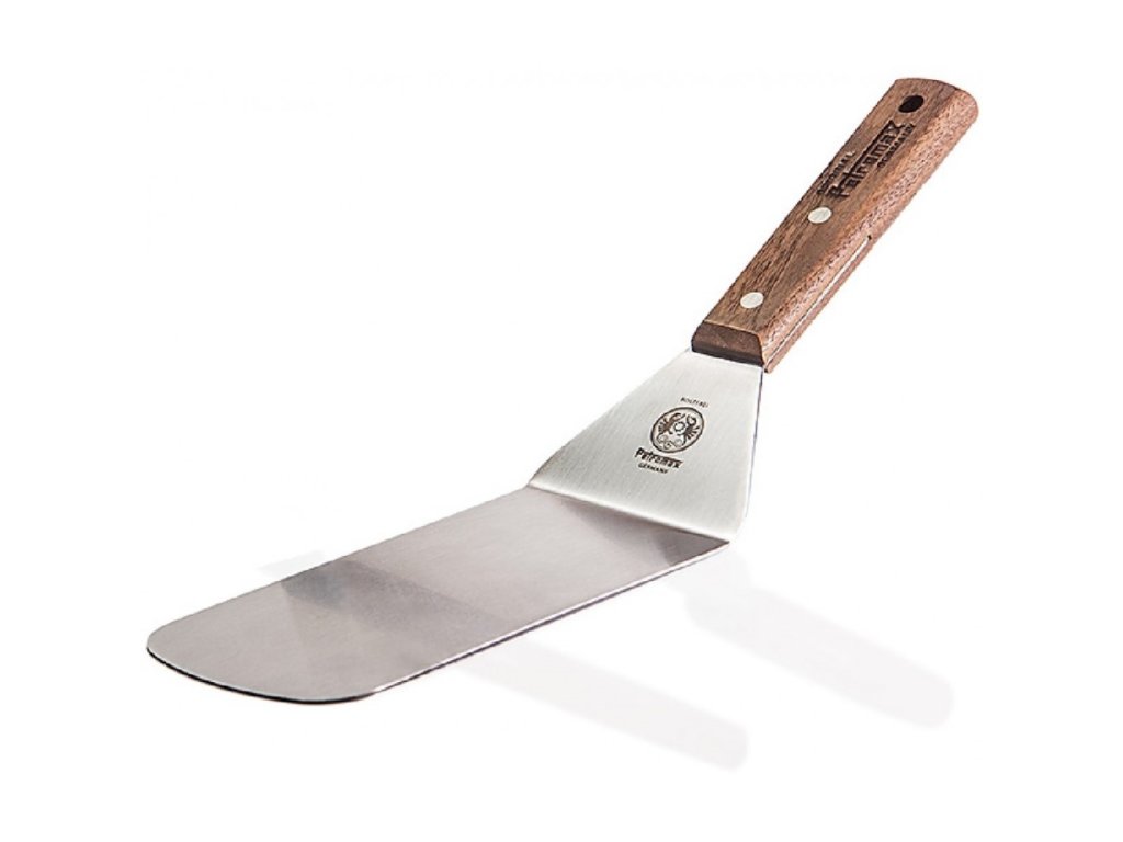 Det högkvalitativa handtaget i valnöt gör den särskilt lätt att hålla. Bladet i borstat rostfritt stål smalnar av i änden, vilket gör det mycket stabilt, men ändå flexibelt och inte lätt att bryta. Bladets ände är också mycket användbar för att skrapa steken från botten av pannan eller grytan. Handtagets ände är försedd med ett hål så att du enkelt kan hänga upp det.