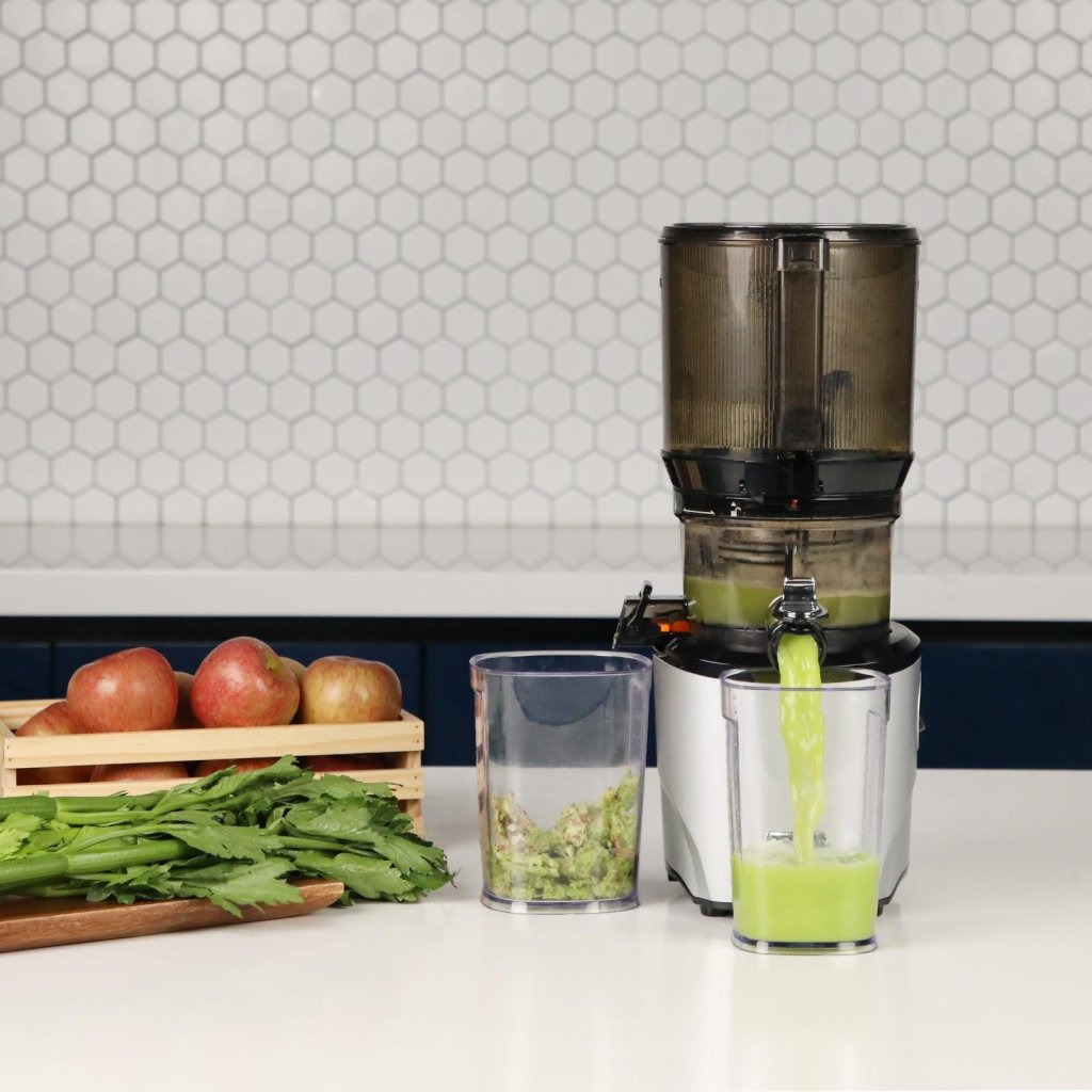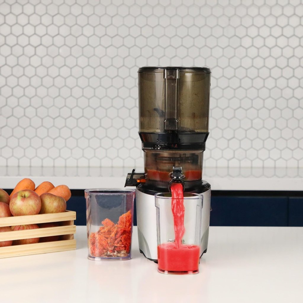 - Att skära upp i presskammaren resulterar i mindre oxidation och minimerar brunfärgning av juicen, så att drycken behåller mer näringsämnen och håller sig fräsch längre.