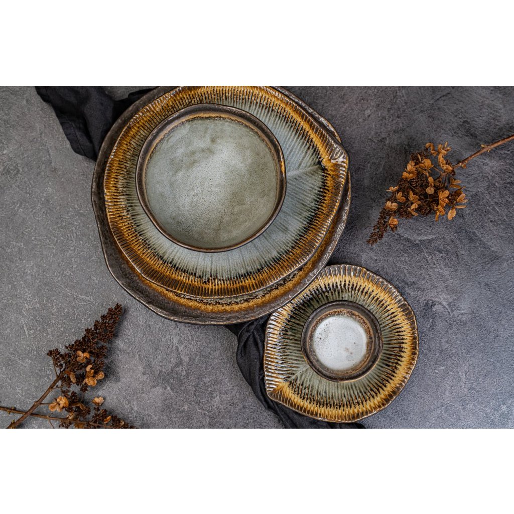 I det här paketet hittar du en mycket intressant asymmetrisk skål med oregelbunden kant från Akane Grey-kollektionen, med en diameter på 15 cm. Glansig skål med krackelerad glasyr har grå färg, gula linjer och bruna kanter.