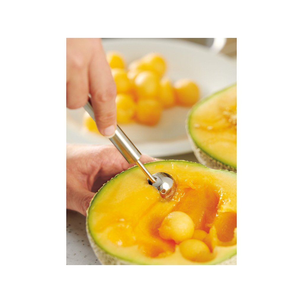 Med hjälp av en liten halvkula kan det mjuka köttet skäras ut. Bollar av gurka, mango, melon, avokado... de rullar runt i salladen eller flyter i fruktskålen. Användartips: När du skär ut ska rörelsen komma något från handleden.