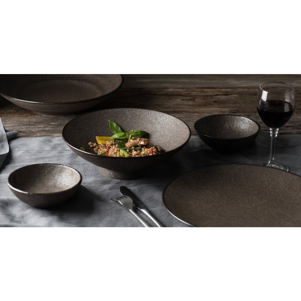 Earth Black-kollektionen kännetecknas av jordnära färger, en kornig yta och en kant kantad med en mörk glansig glasyr. Servisen i den här kollektionen ser ut att vara gjord av sten och kommer att ge din matupplevelse en känsla av antik lyx.