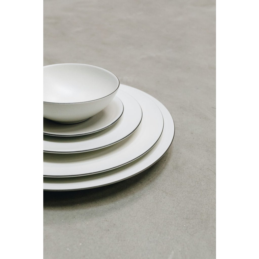 Den vita bomullsdesignen ingår i samlarutgåvan av den eleganta men tidlösa Equinoxe-serien och har en elegans som visar hur skickliga våra hantverkare är. Denna satinemalj framhäver mycket fina bordsserviser och passar i alla inredningar. Den mycket fina svarta kanten som skapats genom att emaljen avlägsnats för hand ramar in tallrikarna som en målning. Denna platta tallrik finns i diametrarna 31 cm, 28 cm, 26 cm, 21 cm och 16 cm - 5 storlekar som ger en harmonisk presentation från förrätt till efterrätt. Den lätt böjda formen gör att du kan hålla kvar saften samtidigt som du får en mycket stor serveringsyta. Formen gör dem stapelbara, lätta att hålla i och starka eftersom keramiken bränns vid hög temperatur och inte är porös. Den passar mycket bra med Rainforest- och Ocean Vibes-finisherna och alla Equinoxe-färger.