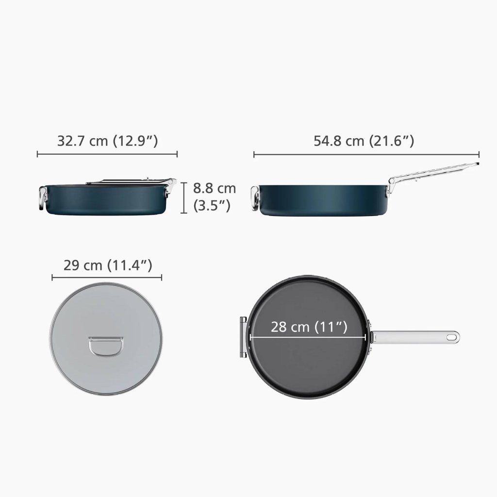 - Genom att fälla ihop det huvudsakliga handtaget kan upp till 50 % mer utrymme sparas jämfört med vanliga pannor, vilket gör den idealisk för mindre kök och begränsade utrymmen.