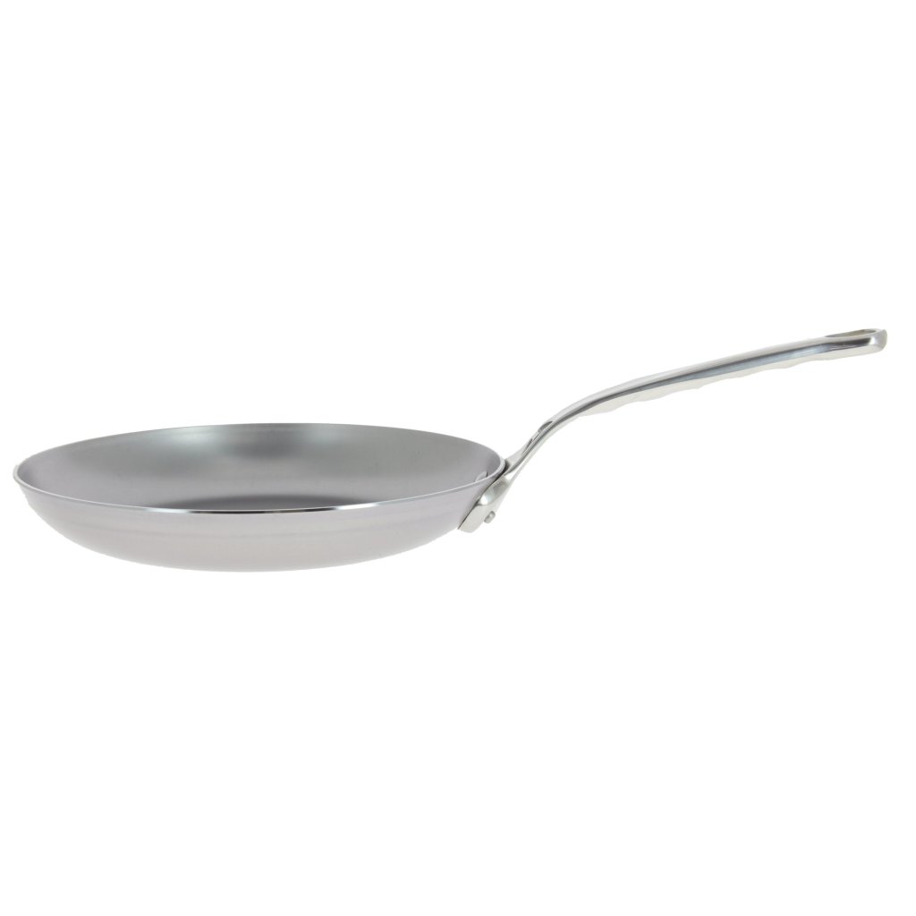 - pannan har ett elegant nitat handtag i rostfritt stål i fransk stil som håller sig svalt under tillagningen
