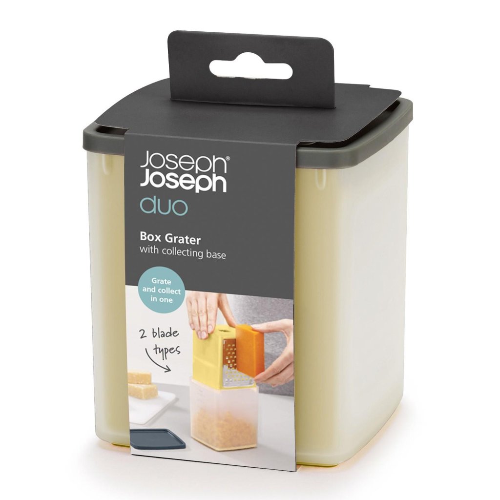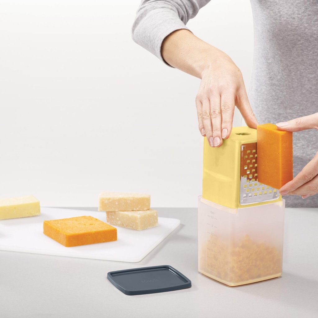 - OstrivjÀrn med behÄllare Joseph Joseph DUO möjliggör bekvÀm rivning och samtidigt uppsamling av osten direkt i den praktiska mÀtsatsen.