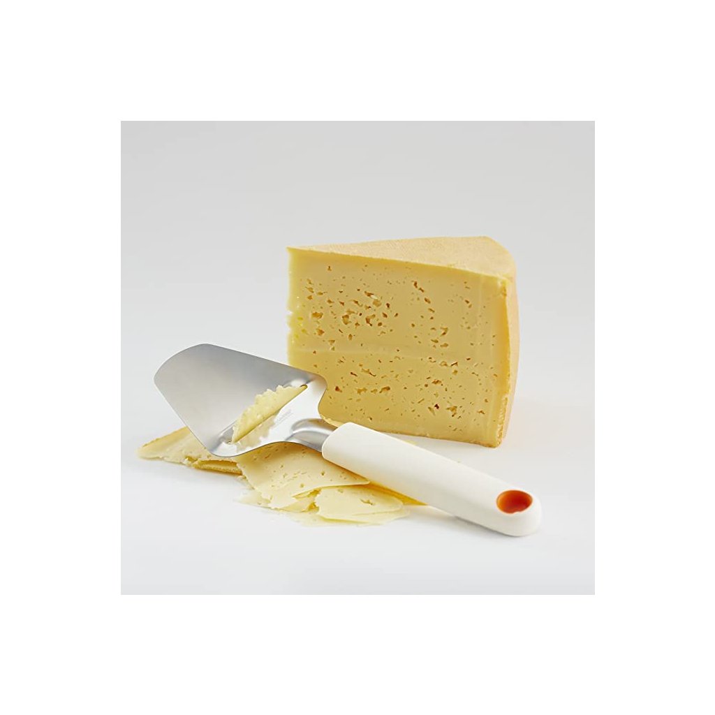 Ergonomisk osthyvel med mjukt handtag, särskilt bra för Emmental- och Goudaost. Det rostfria bladets form förhindrar att ostskivan går sönder när den skärs.