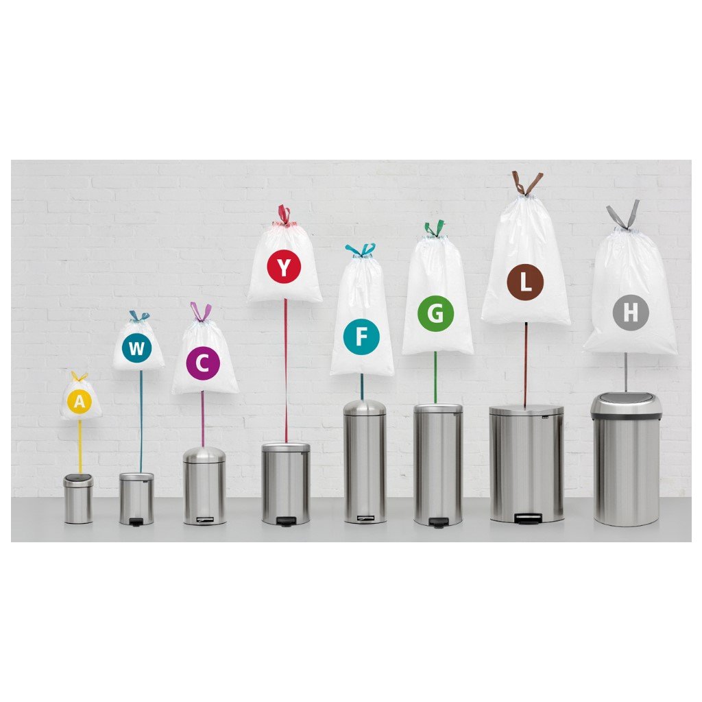 Högkvalitativa påsar av extra stark plast (HDPE) är avsedda för 12-liters soptunnor Brabantia. Påsens kanter förblir dolda. Åtdragningsband, extra starkt material.