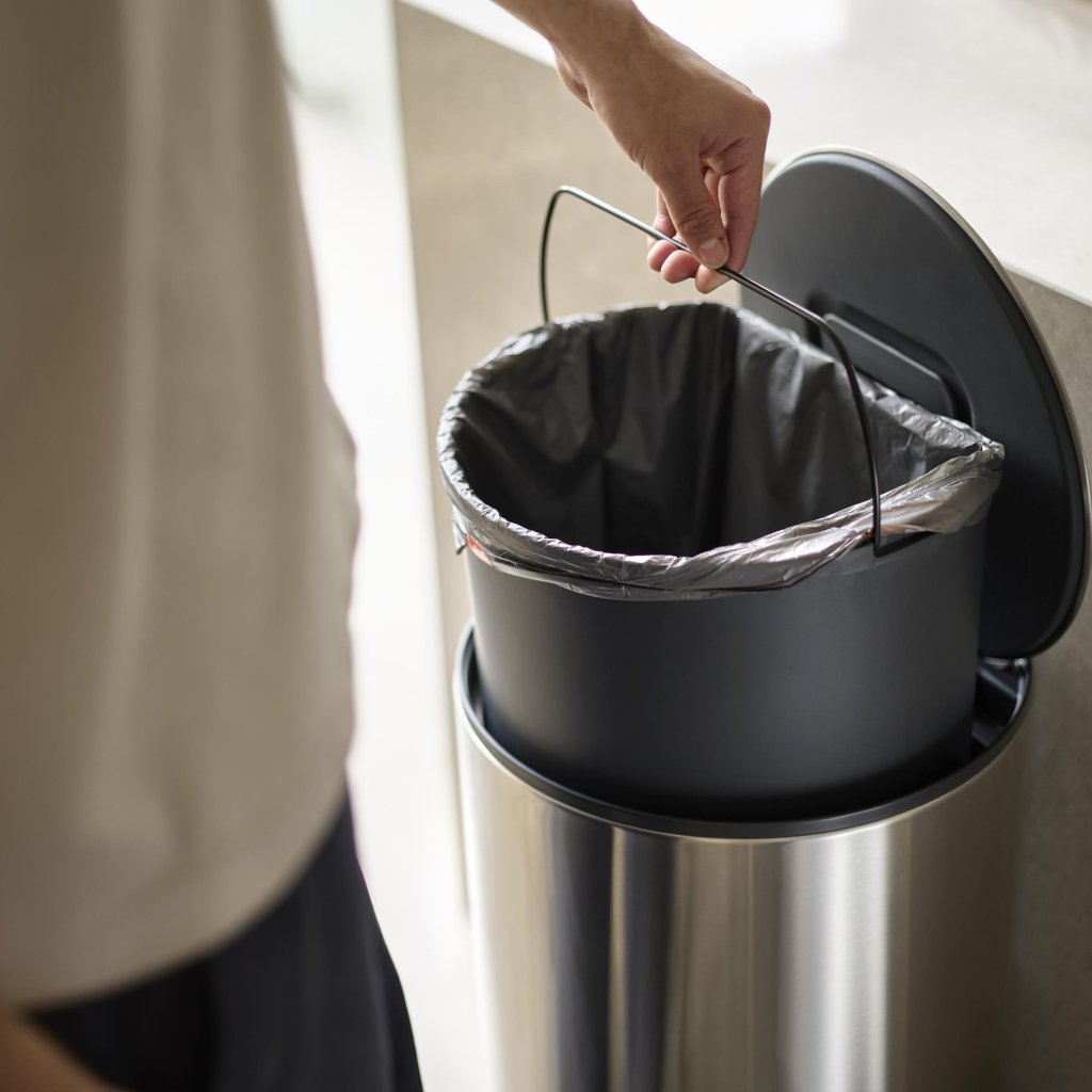 - Den uttagbara inre behÄllaren möjliggör snabb tömning av avfall och underlÀttar samtidigt regelbunden rengöring av sopkorgen.