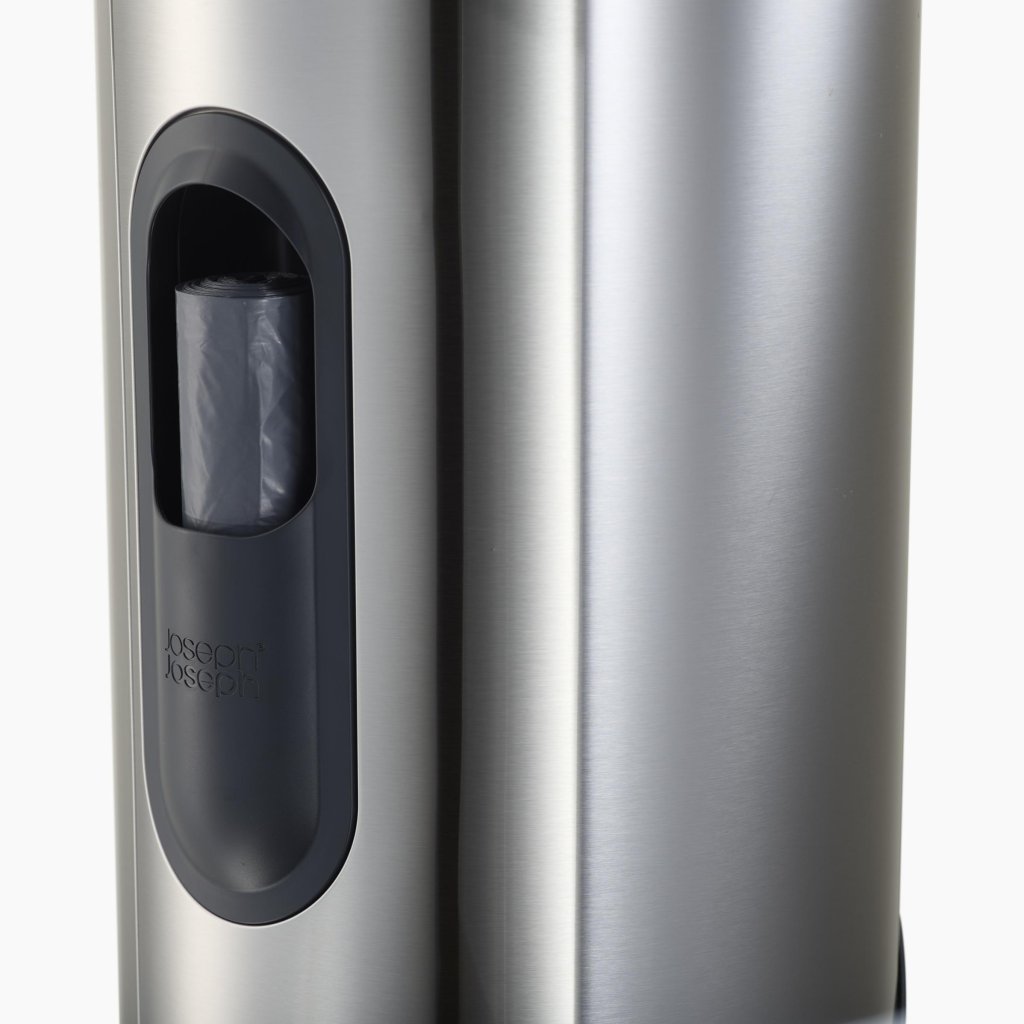 Vissa sopkorgar försöker vara diskreta. Den hÀr Àr sÄ diskret att du mÀrker den. Cylindern i rostfritt stÄl med en mjukt böjd linje ser nÀstan ut som ett designobjekt som av en slump har bestÀmt sig för att hantera ditt dagliga avfall.