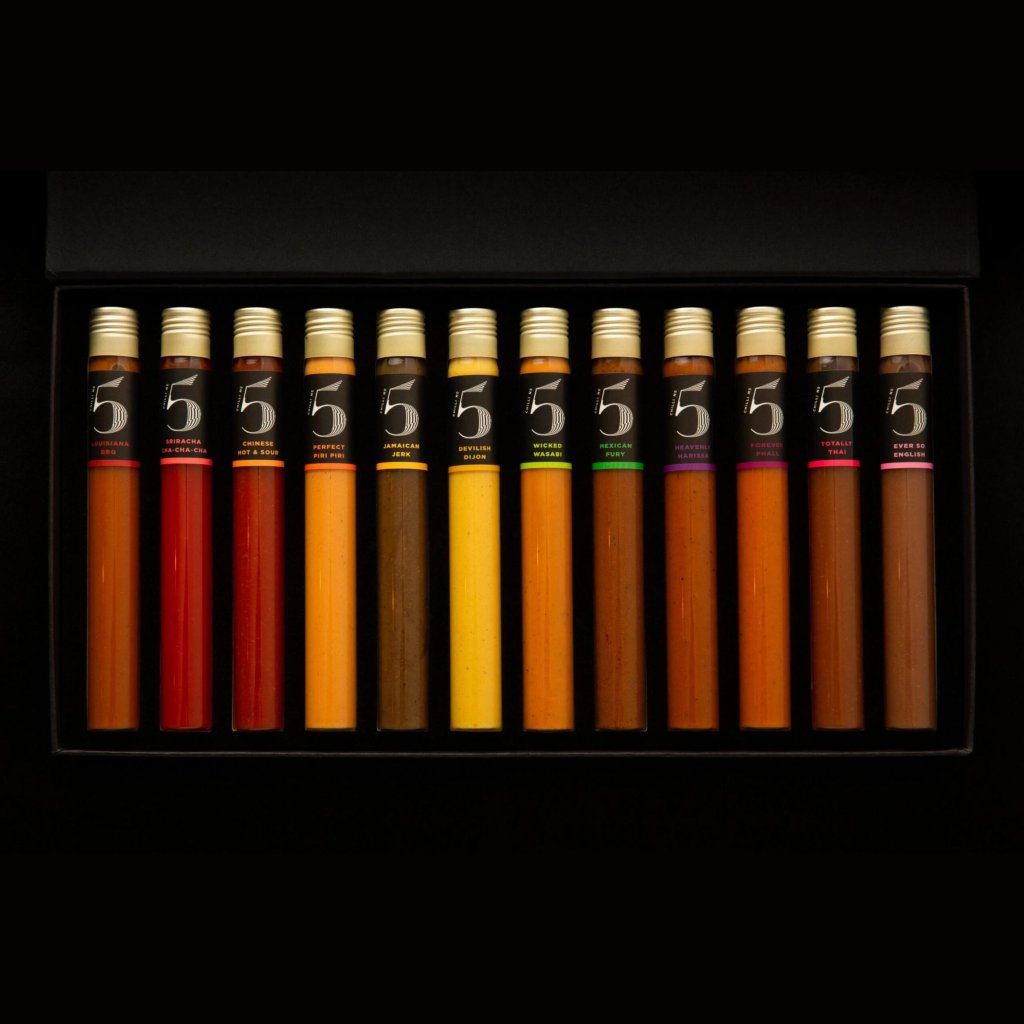 - Elegant svart förpackning med vit text och logotyp Chilli No5 ger hela setet ett lyxigt och elegant utseende som passar alla tillfällen.