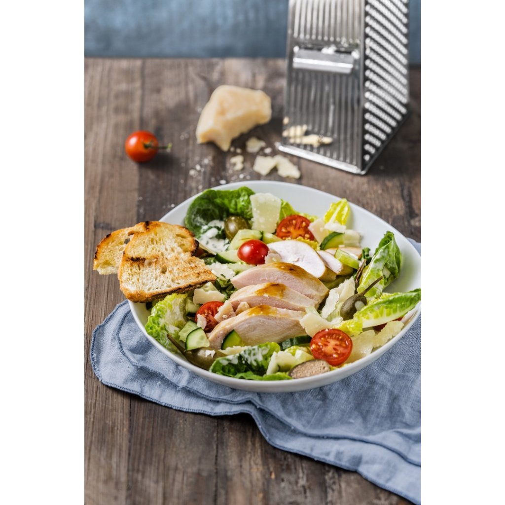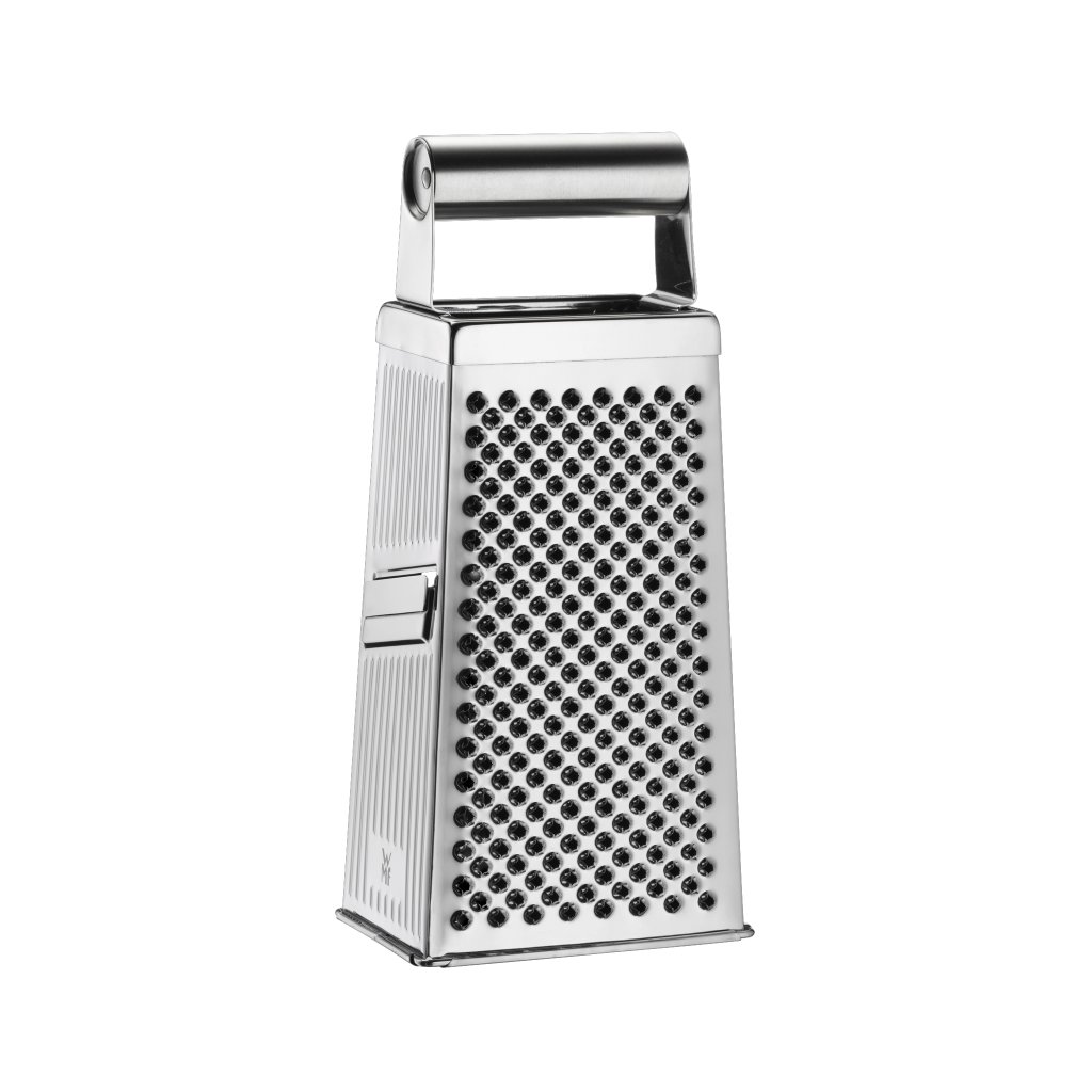 Robust, fyrsidigt rivjärn med praktiskt handtag. Den är mycket vass och tillverkad av Cromargan® (rostfritt stål 18/10). Fyra sidor är för gurkor, ost, hårda livsmedel och potatis. Men du kan även riva andra frukter och grönsaker med den. Använd rivjärnet för att skapa skivor, chips och spån i två olika bredder. Den tål maskindisk.