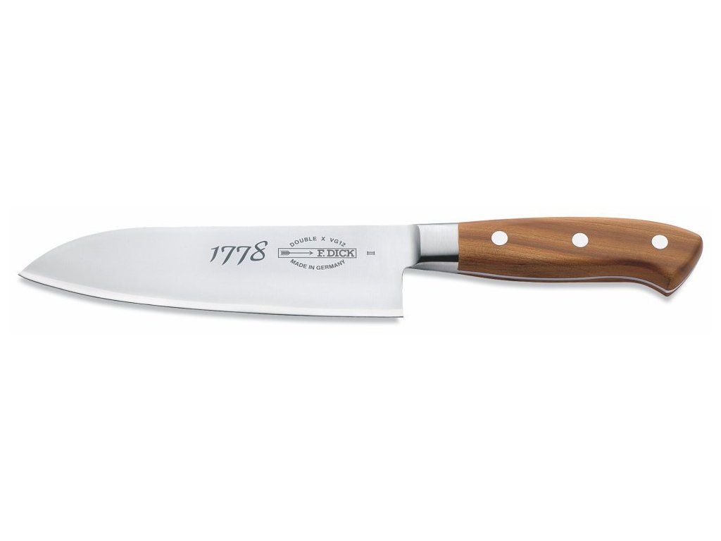 Smidd, begränsad jubileumsserie: kärnan i knivarna i denna exceptionella serie består av mycket tunna lager av höglegerat kolstål "Double X VG 12" med extrem hårdhet från 61˚ HRC. Resultatet är ett mycket effektivt snitt och en betydligt längre livslängd för klingan. Den skiktade kärnan av rostfritt stål är livsmedelsvänlig. Alla knivar i 1778-serien slipas och dressas för hand och handtaget och bladet tillverkas också av Dick-specialister.
